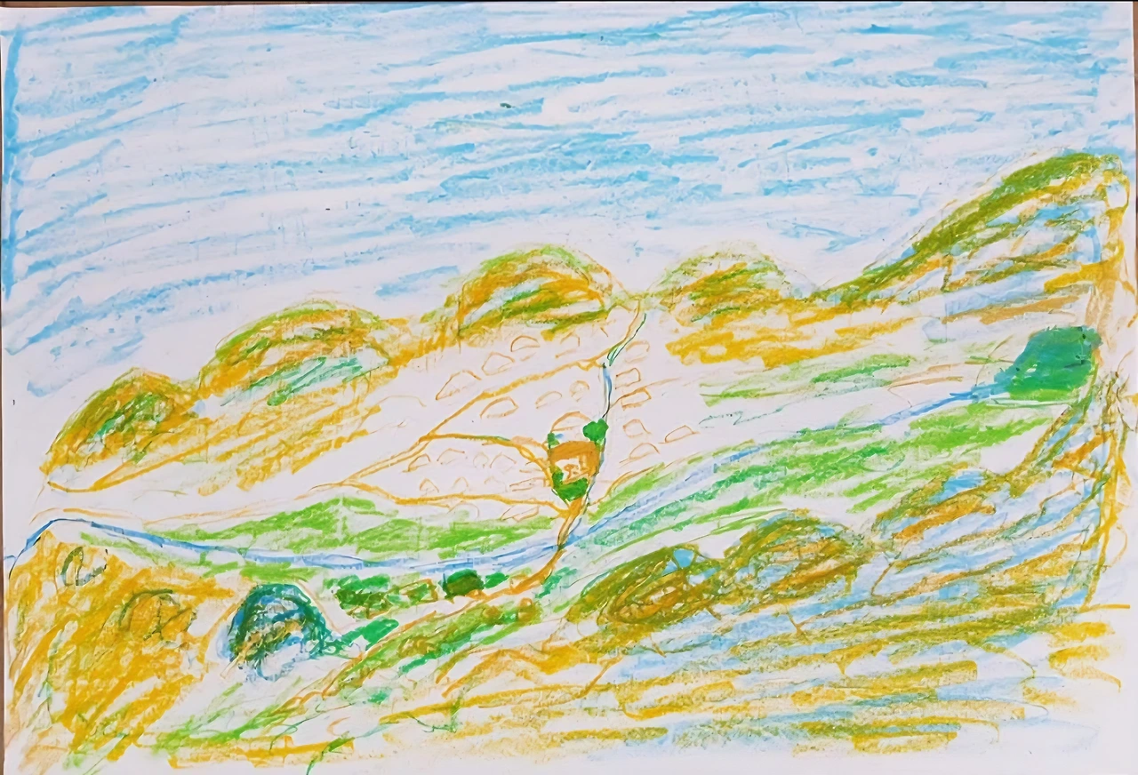 “여기에는 작은 도랑이 있었고, 이쪽 산에는 나무가 별로 없이 민둥산이 있었어.