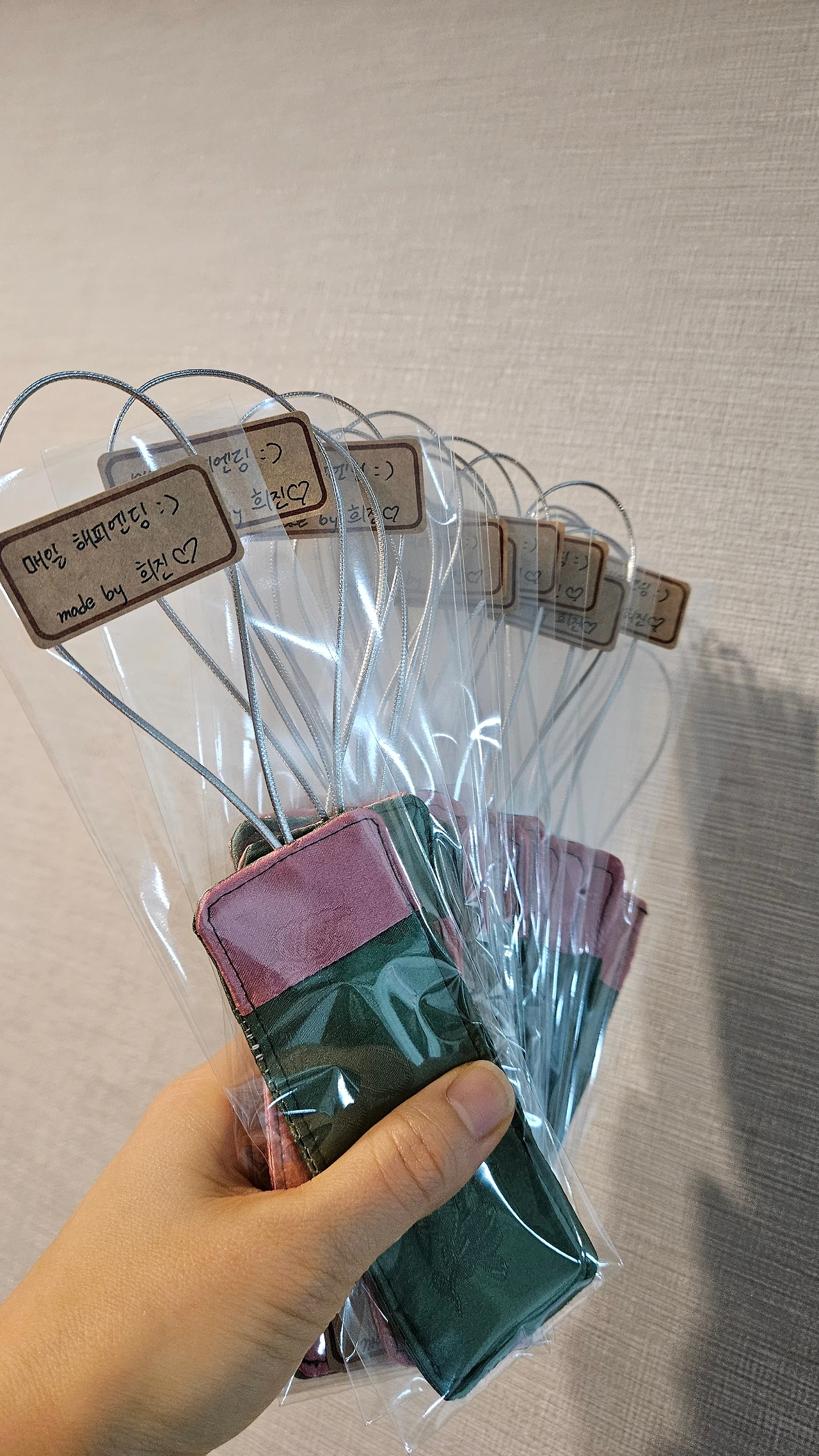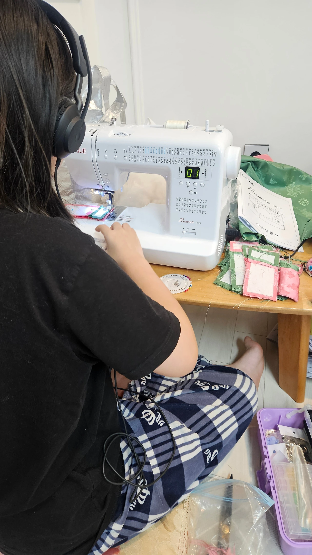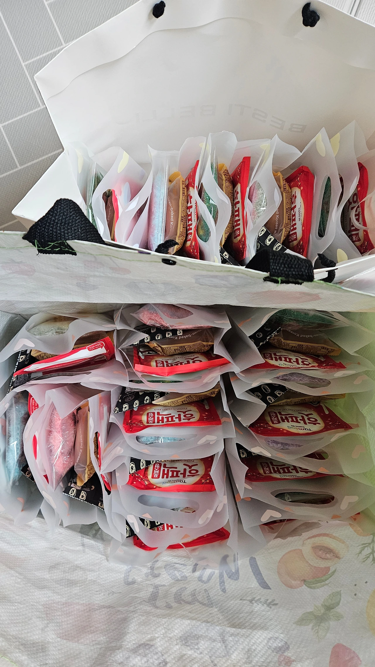 어느새 소잉 수강 경력 5년 차인 딸에게 처음으로 작업을 의뢰했다. 생각보다 정성이 많이 가서 북토크 전날 새벽 1시까지 아이는 미싱을, 나는 실밥을 다듬는 상황이 펼쳐졌다. 우아하게 사전 리허설을 하겠다는 계획은 온데간데없이 사라졌지만 그만큼 정성을 한가득 담았다. 마지막으로 나의 시그니처 '매일 해피엔딩' 장착 완료! 날씨가 추우니까 핫팩, 간단한 간식도 살포시.