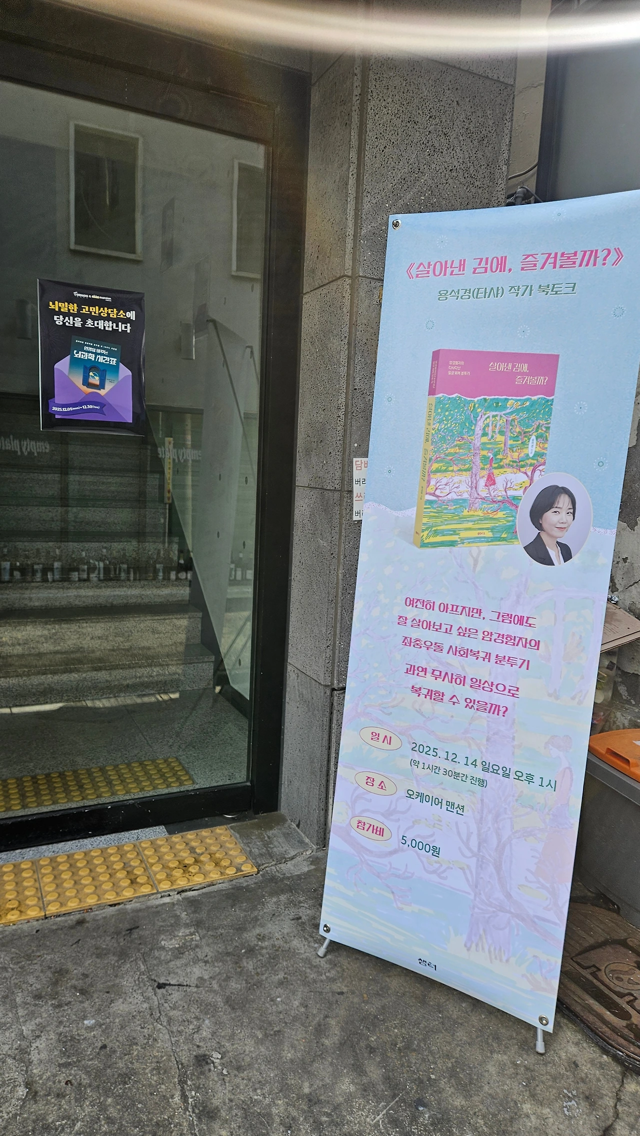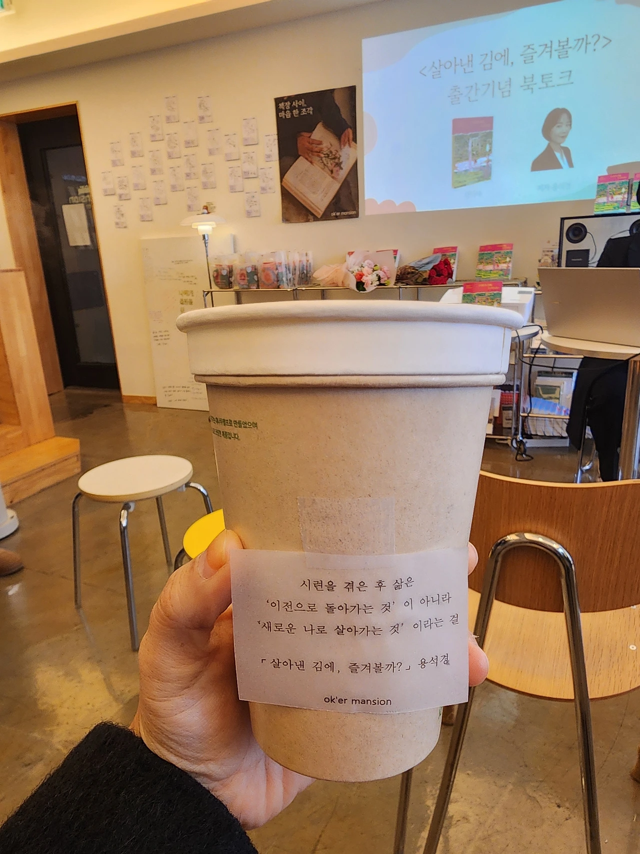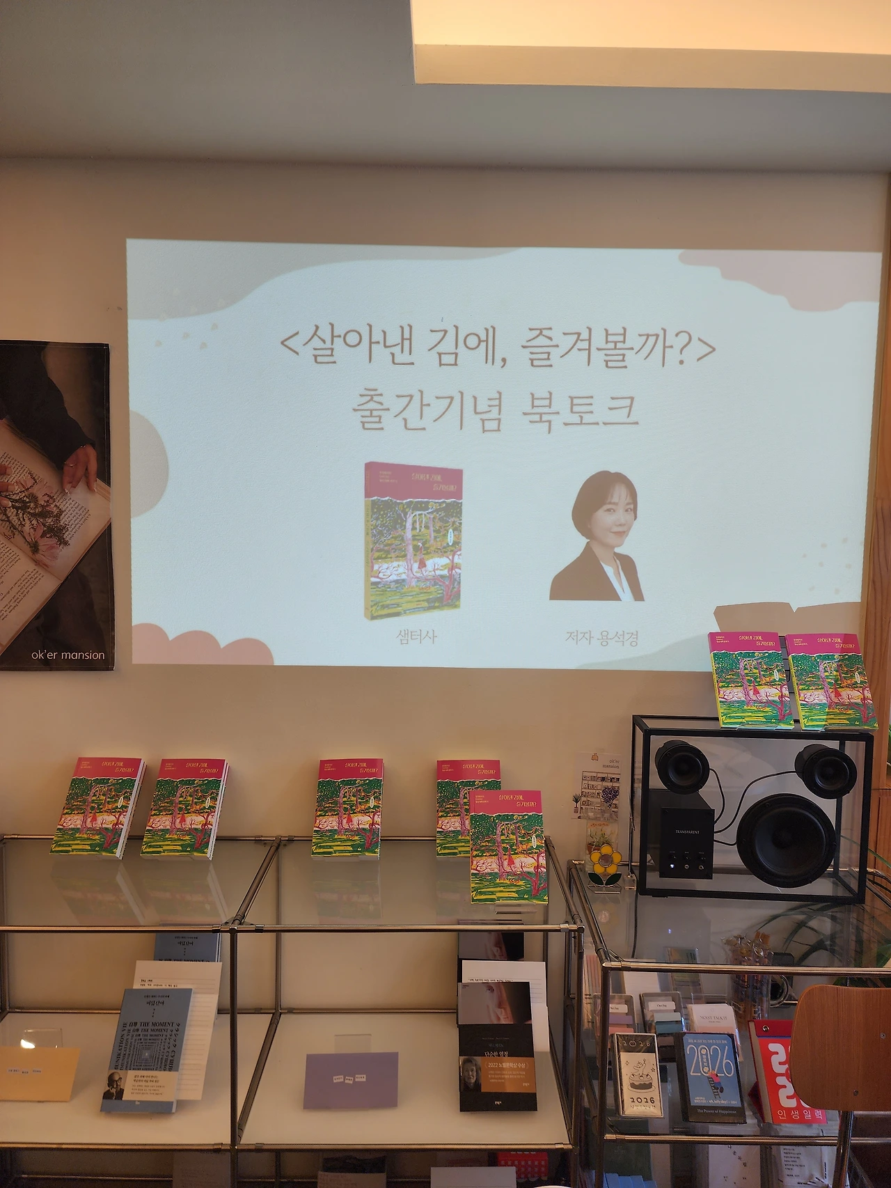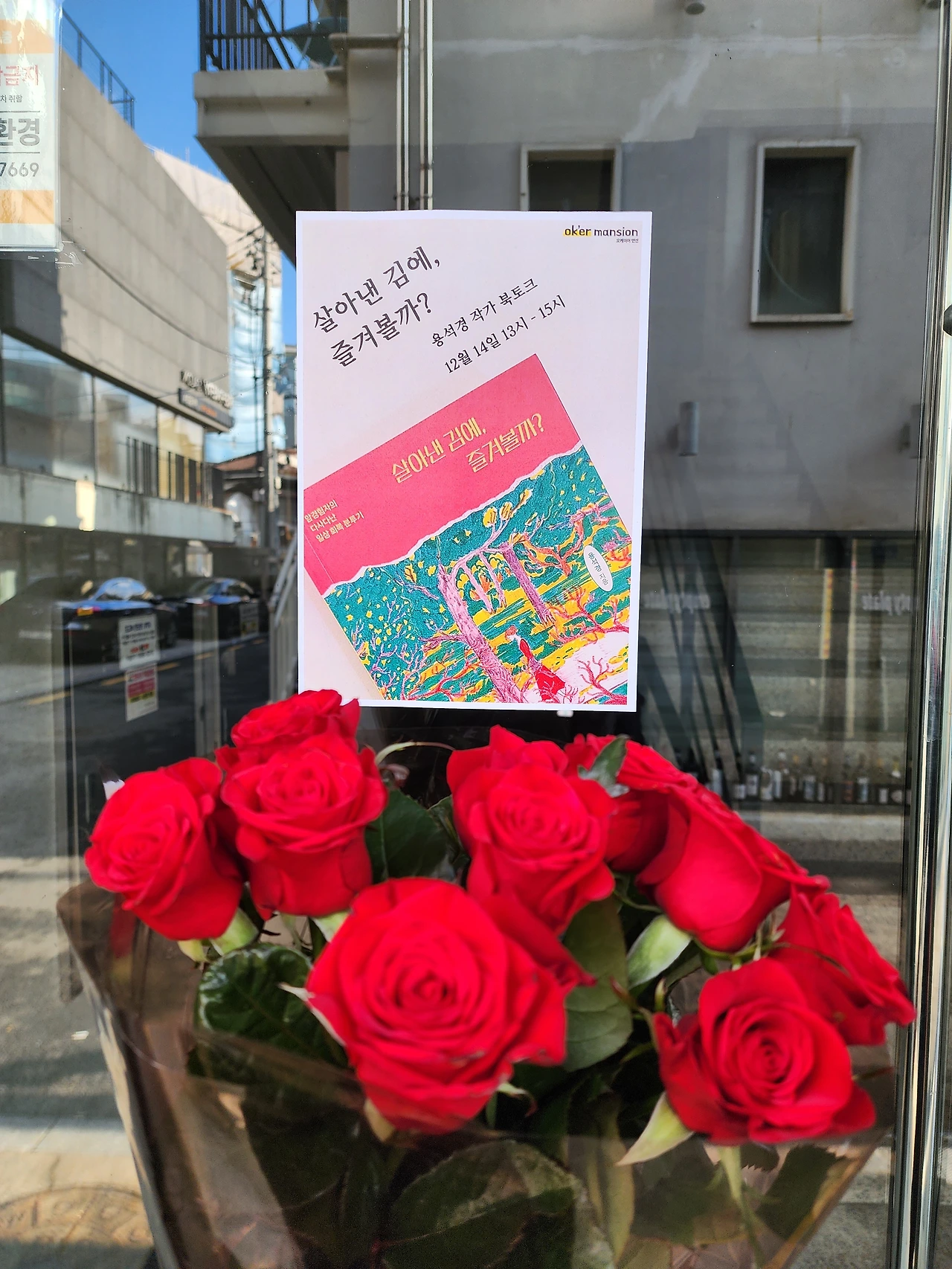 두근두근, 긴장 때문인지 잠을 설쳤지만 아침에 벌떡 일어나서 부산스레 출발 준비. 주말 상경에 운전이 살짝 겁나지만 선물이랑 짐 때문에 조심조심. 중간에 길을 잘못 드는 바람에 잠시 식은땀을 흘렸지만 무사히 도착했다. 북토크 장소는 상수동 카페거리의 오케이어맨션! 골목에 들어서는 순간 핫플 느낌이 폴폴 난다. 예쁜 장소에 포스터에 현수막까지 준비해 주신 출판사에 다시 한번 감사 감사!