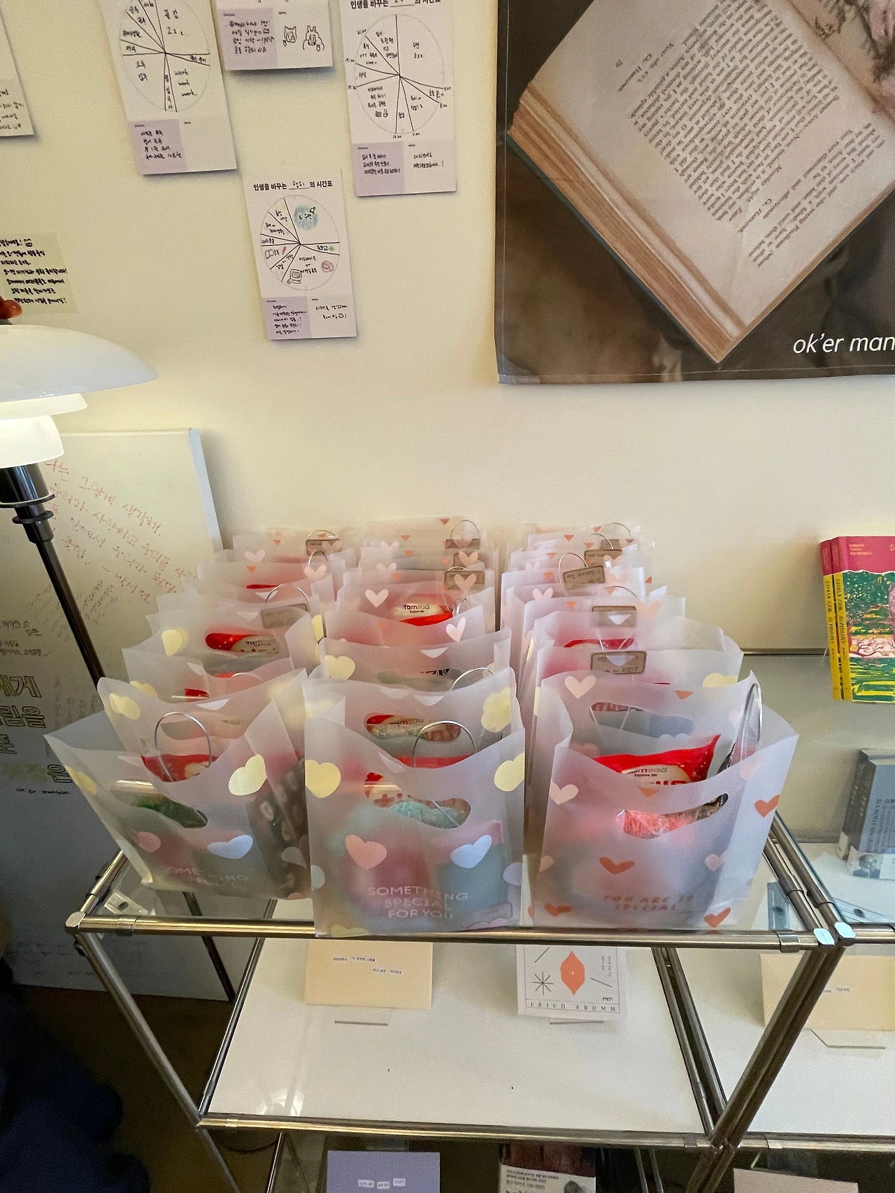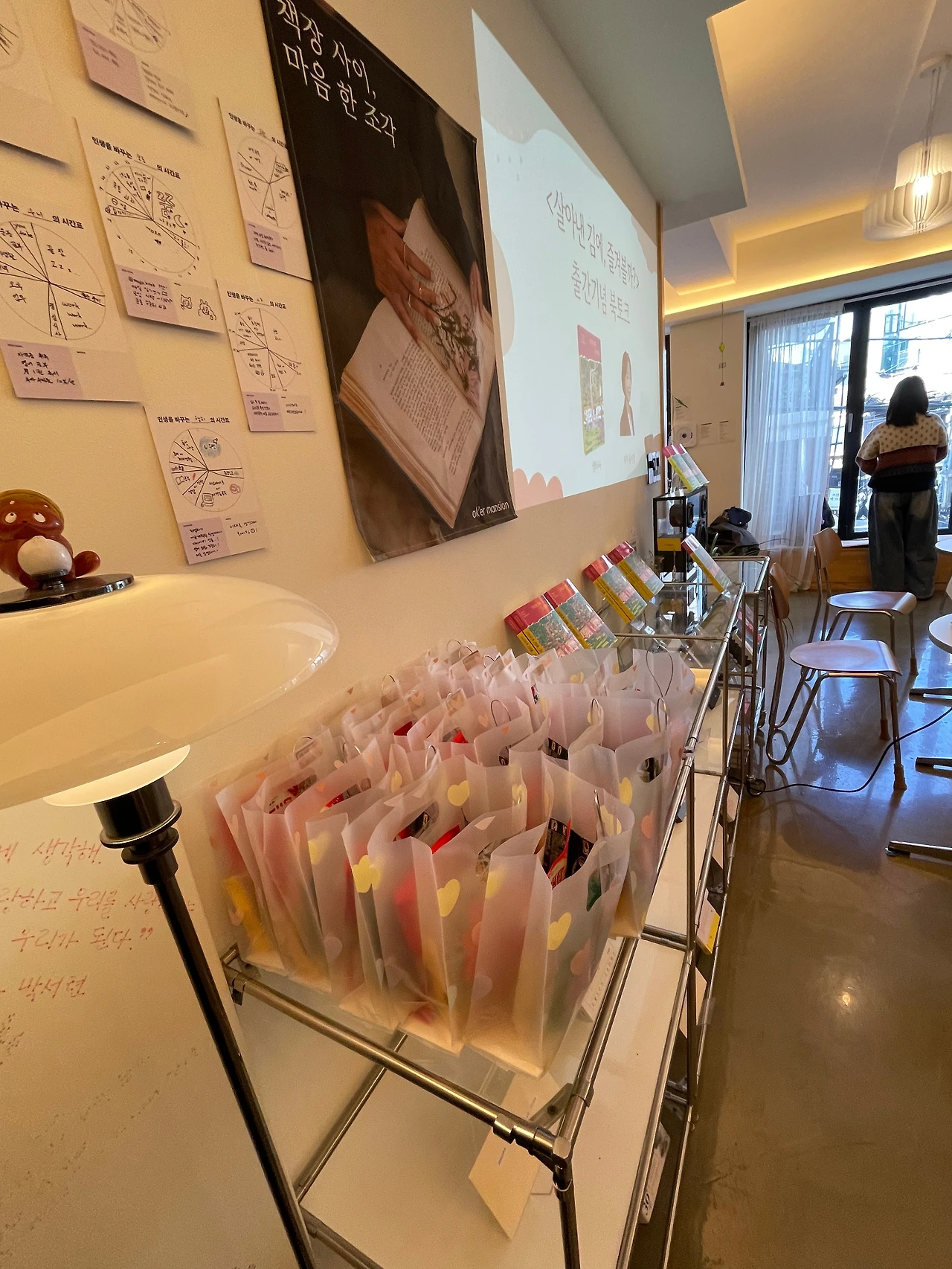 짧은 동영상이 포함되어 있어서 미리 체크하고, 기념 선물도 세팅하고, 틈틈이 책방 구경도 했다. 크지는 않지만 오밀조밀 사장님의 애정이 듬뿍 담긴 느낌이 난다. 소규모 북토크에 어울리는 아기자기하고 예쁜 공간이라 참석하신 작가님들도 탐을 낸 건 안 비밀~
