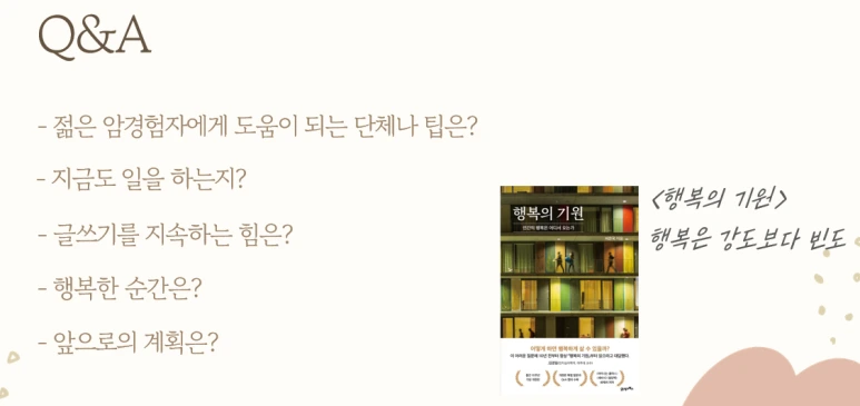 처음은 지금 이 자리의 시작이자 삶의 터닝포인트가 된 암 진단. 인생의 깜짝 이벤트를 받아들이고 지에 오기까지의 여정. 물론 이전의 치열하게 달렸던 삶도 자연스럽게 따라 나왔다. 지금의 나와는 너무 달라 보이는지 사회자님이 정말 이런 사람이었냐며 친구에게 검증까지 마쳤다.