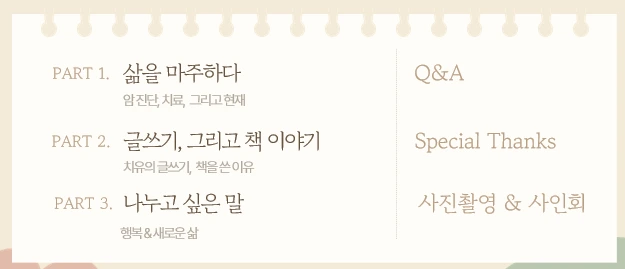진단 - 수술 - 항암 - 방사로 이어진 치료, 그 시간 속에 나와 가족과 주위 사람들. 북토크 참석자분들께는 특별히 나의 툼레이더 여전사 룩(배액관 장착)과 박미선 언니 뺨치는 멋진 민머리 셀카를 공개했다! (궁금하죠? 그러면 다음 북토크 때는 꼭~ 오셔요^^)