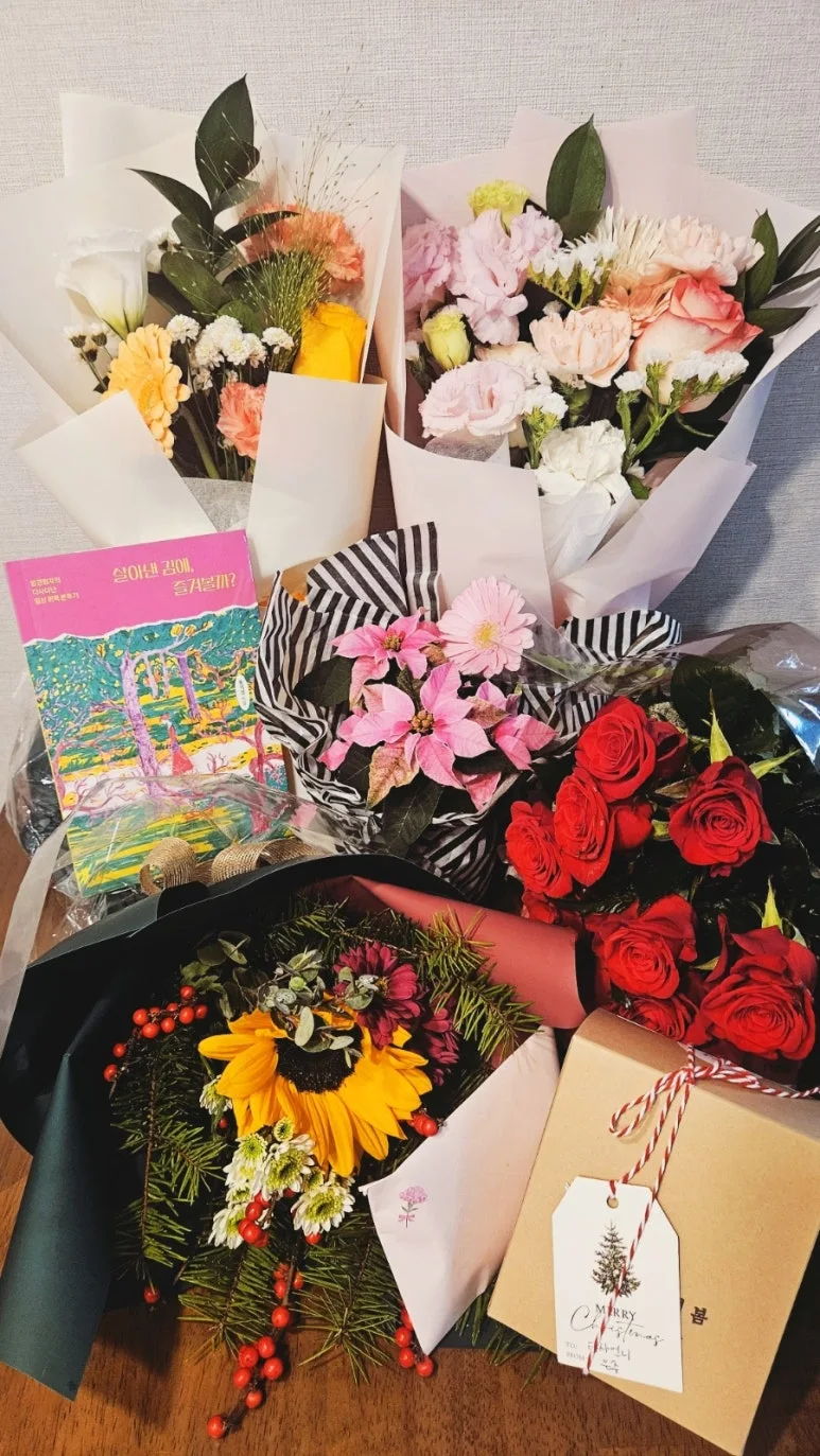 브런치 멘토 류귀복 작가님은 '아내에게 꽃을 선물하기 위해 펜을 듭니다'라고 했는데, 저는 '꽃을 받기 위해 펜을 듭니다'라고 할까 봐요. 북토크가 아니고서야 이렇게 많은 꽃과 선물을 받을 일이? 행복한 기억 오래오래 간직할게요.