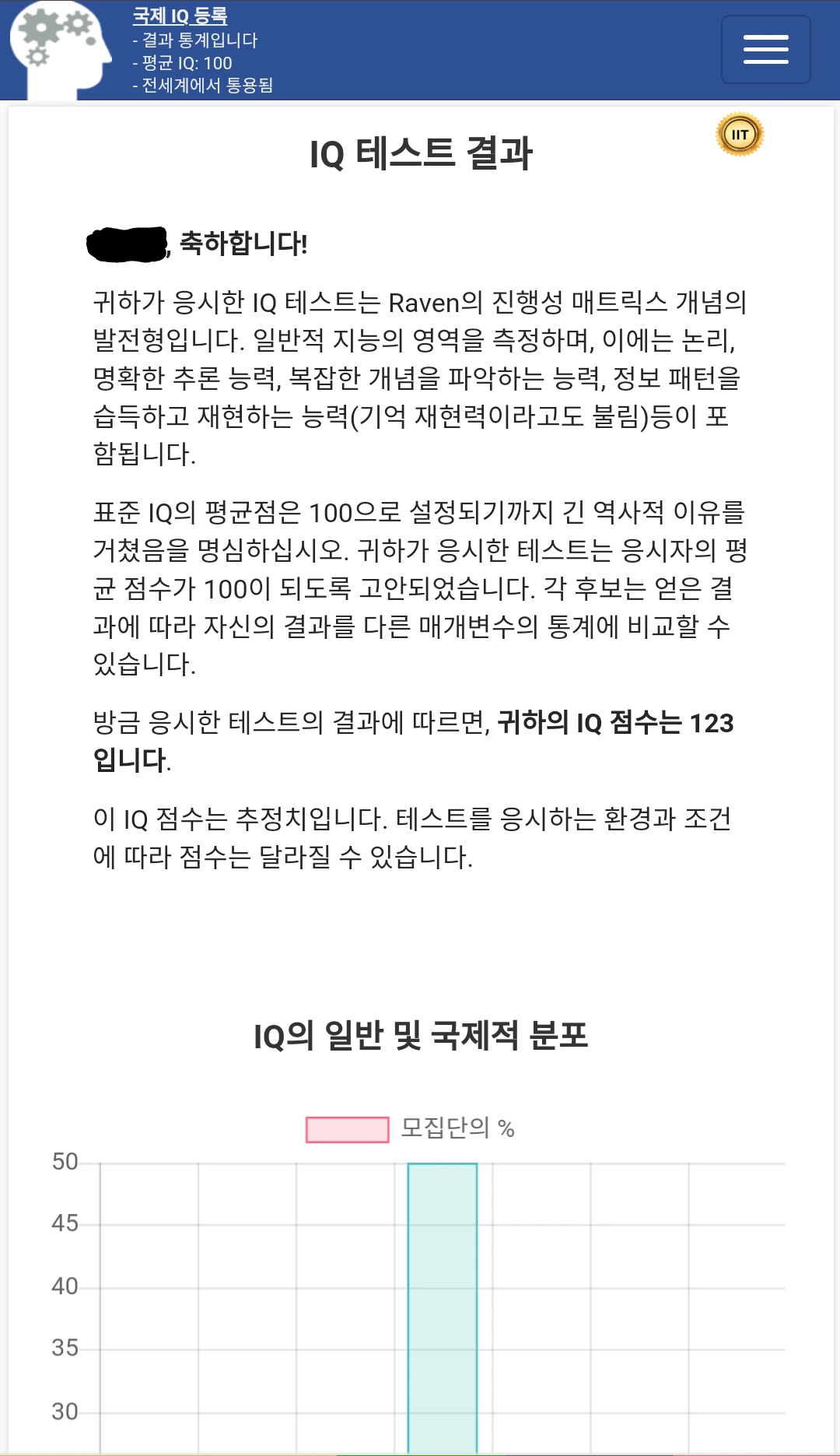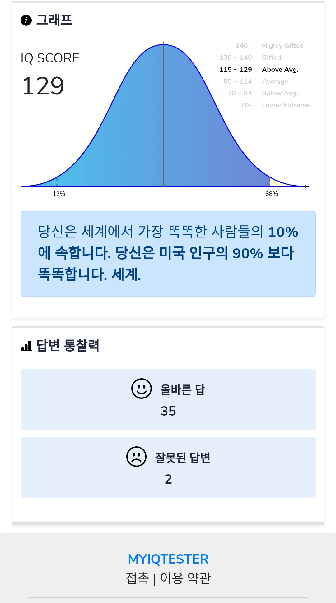 어쨌든 다른 아이큐 테스트를 해보니 120이 나오거나 127 정도가 나오는 등 뒤죽박죽이었지만 확실한 것은 120 이하로 내려간 결과는 없었다.