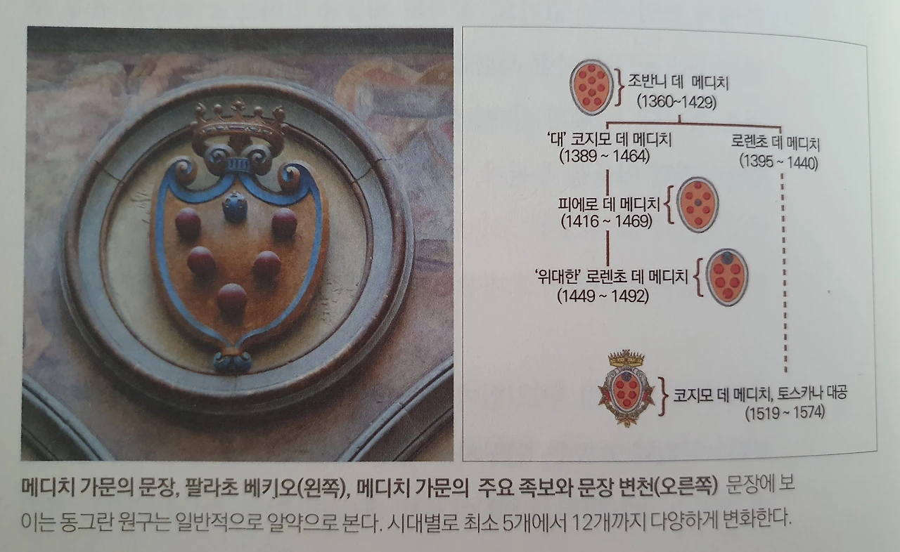 가문의 문장이나 이름에서 알 수 있듯이 의사나 약재상에서 시작해, 직물업, 무역업등을 하다가 14세기 은행업으로 엄청난 부를 축적한 메디치 가문은 비슷하게 부를 쌓은 여느 상인들과는 다른 길을 걷는다.