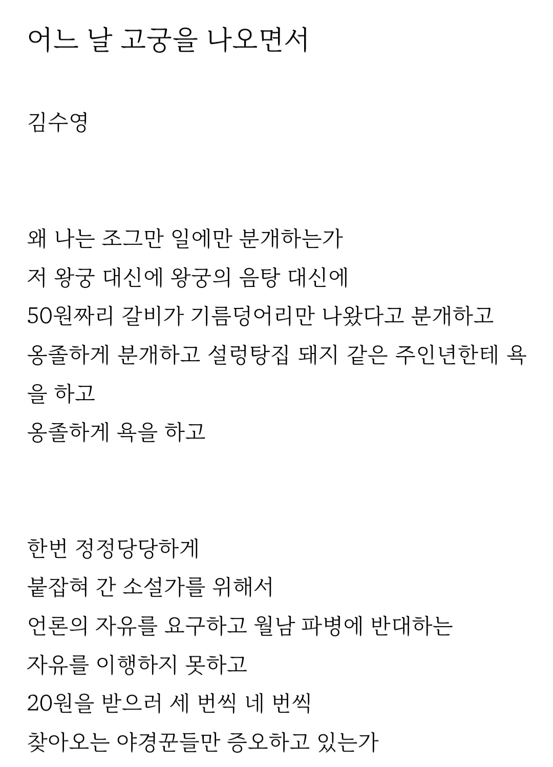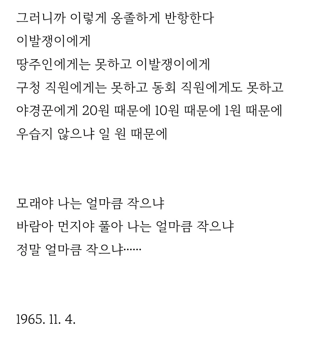박완서의 수필 제목이면서 김수영의 시, 첫 구절이기도 한 이 문장이 생각난 건 이 때문이었다. 비교할 순 없지만 시인이 느꼈을 그 비루함의 감정이오늘, 우울한 내 마음 위로 절절이 내려앉았다.