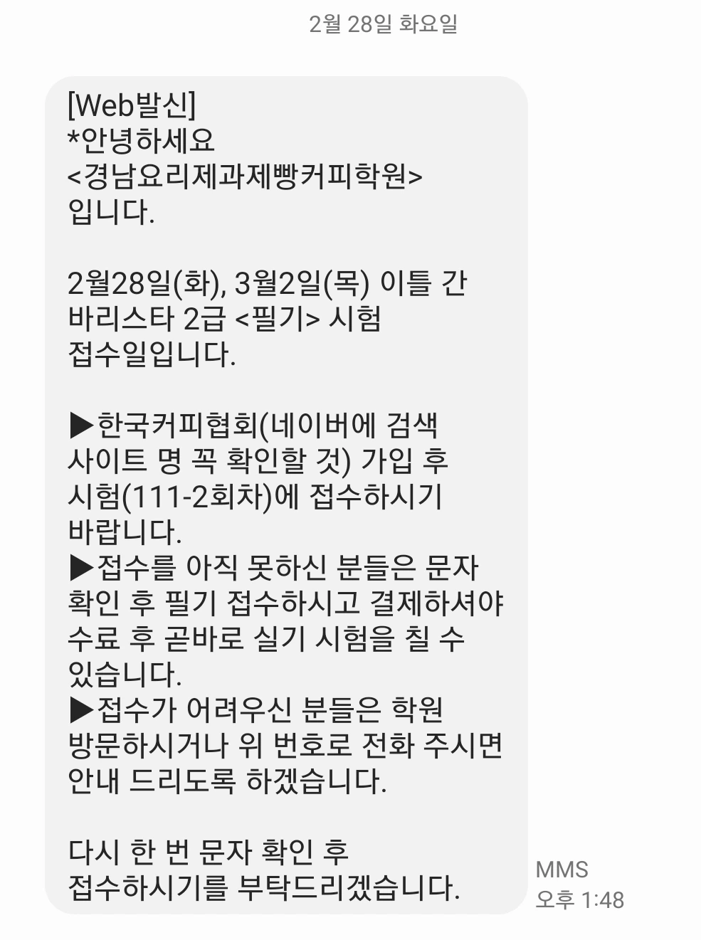 커피 바리스타 2급 필기시험 접수에 관한 내용이었는데 발신처는 3월 7일부터 수강하기로 한 학원이었다. 아직 수업도 듣기 전이었고 커피에 관해선 일도 모르는 나에게 필기시험을 접수하라고?