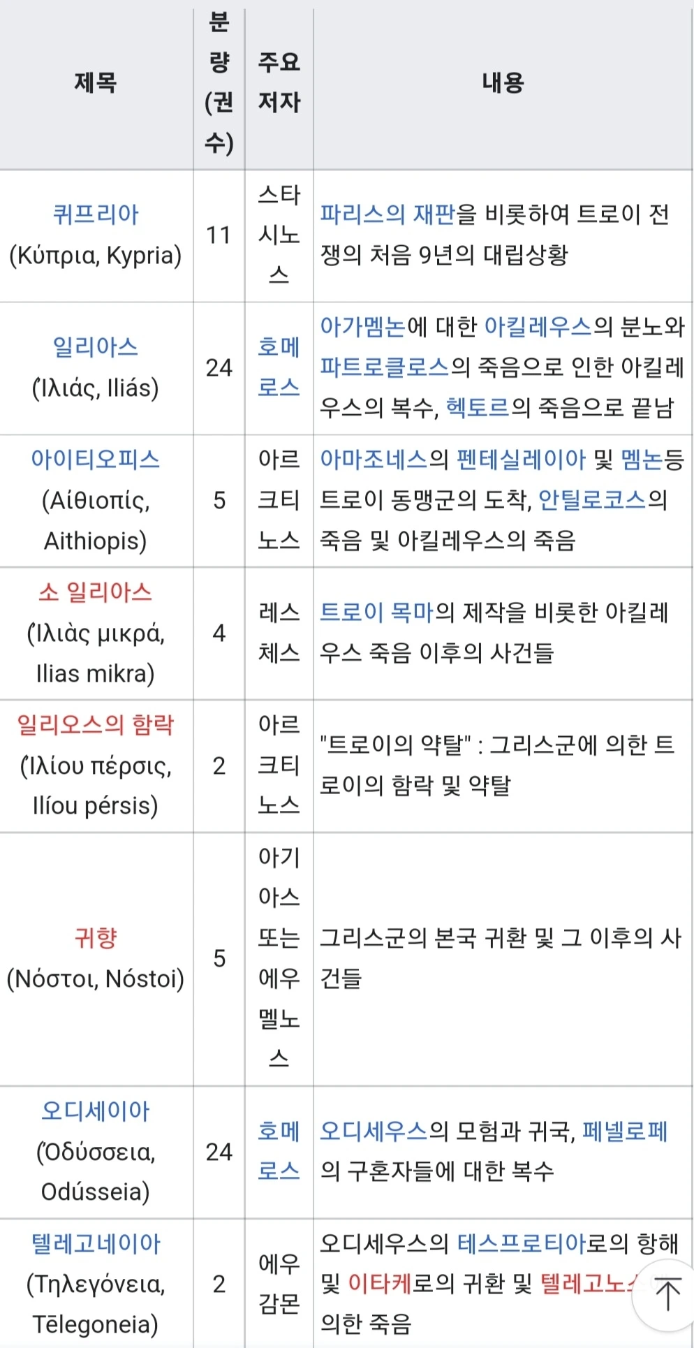 위의 표에서 알 수 있듯이 트로이아 서사시권 총 8편중, [일리아스]는 그 두 번째에 속하고, [오디세이아]는 일곱 번째에 해당하는 이야기이다. 고대 그리스의 수많은 영웅 서사시 가운데 오직 이 두 편만이 온전히 살아남아 그 시대의 수준 높은 작품세계를 엿볼 수 있는 귀한 자료로 평가되고 있다.