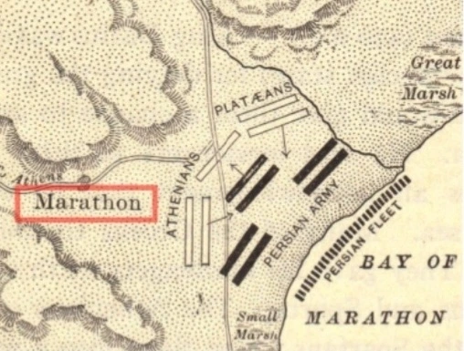 이러한 대형으로 서서히 행군하던 그리스 병사들은 페르시아 궁병들의 사정거리인 약 1.6km 안에 들어서자 전속력으로 진군하며 페르시아 군의 화살로 공격받는 시간을 최소화했다.