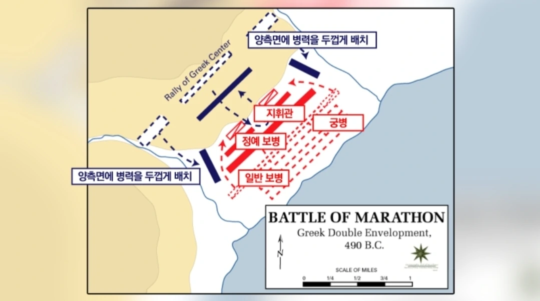 마라톤 전투에서 대제국 페르시아를 상대로 약소국 그리스가 승리할 수 있었던 것은 '밀티아데스'라는 장군의 의 뛰어난 용병술 덕분이었다.