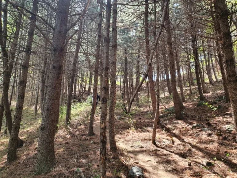 우린 정상이 머지않았다는 희망을 품고 막 발을 들여놓은 소나무 숲에서 점심을 먹기로 했다.