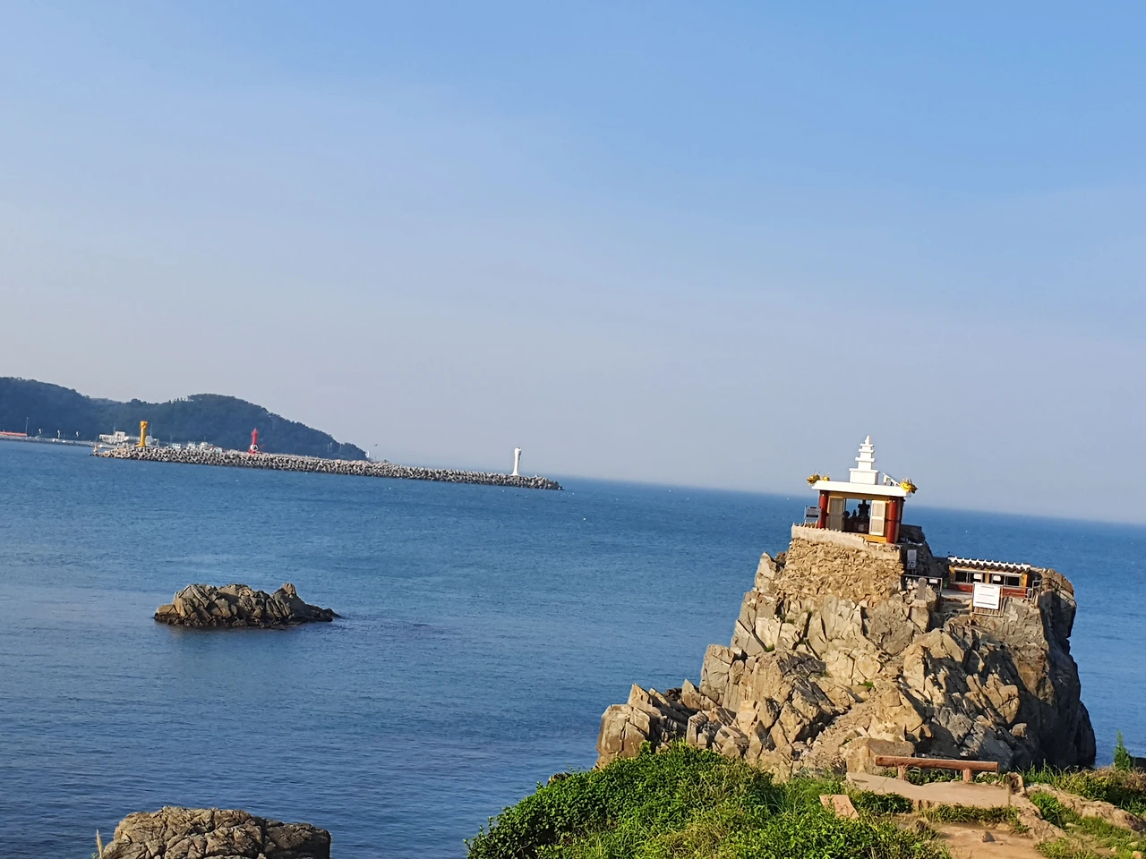 그리고 저만치서 바다 깊이 움푹 들어서 솟아있는 커다란 바위산 위에 작은 사당 같은 건물이 시선을 끌었는데 사진작가들도 뷰 명당으로 자주 찾는다는 오랑대였다.