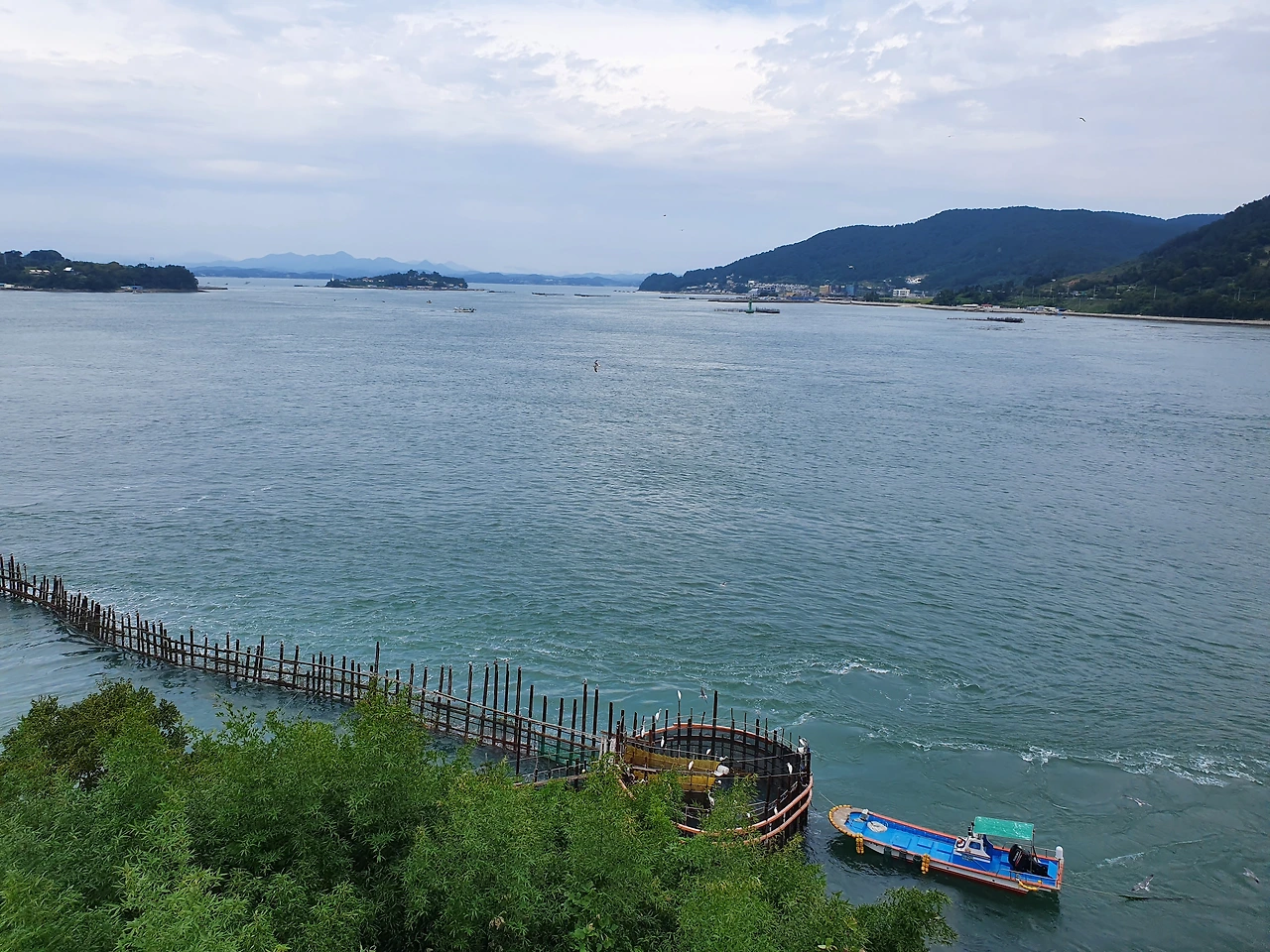 정류소 정문으로 내려오자 바로 지척에 배 모양의 전망대가 명물인 듯 시선을 끌었다. 여기 또한 바다로 둘러싸인 경치가 일품이라 연거푸 사진을 찍다 보니 전망대 바로 아래에 재래식 멸치잡이 장치인 죽방렴이 설치되어 있는 게 눈에 띄었다. 안내문에 따르면 관광용이 아닌 생업용으로 사천에만 20여 개 이상이 있다고 한다. 죽방렴 방식으로 잡은 죽방멸치는 몸에 상처도 없고 모양이 고울뿐 아니라 기름기와 비린내가 적어서 비싼 값에 팔려나간다고 하니 그 수고가 헛되지 않아 오래 보존되어 올 수 있지 않았나 싶다.