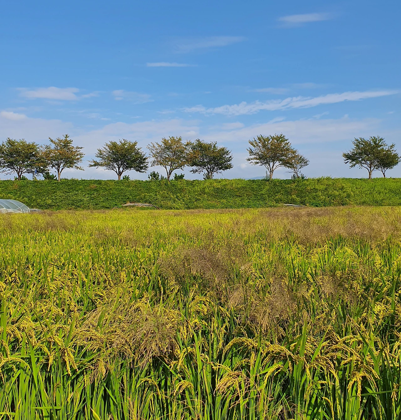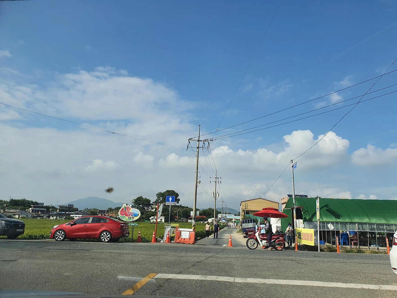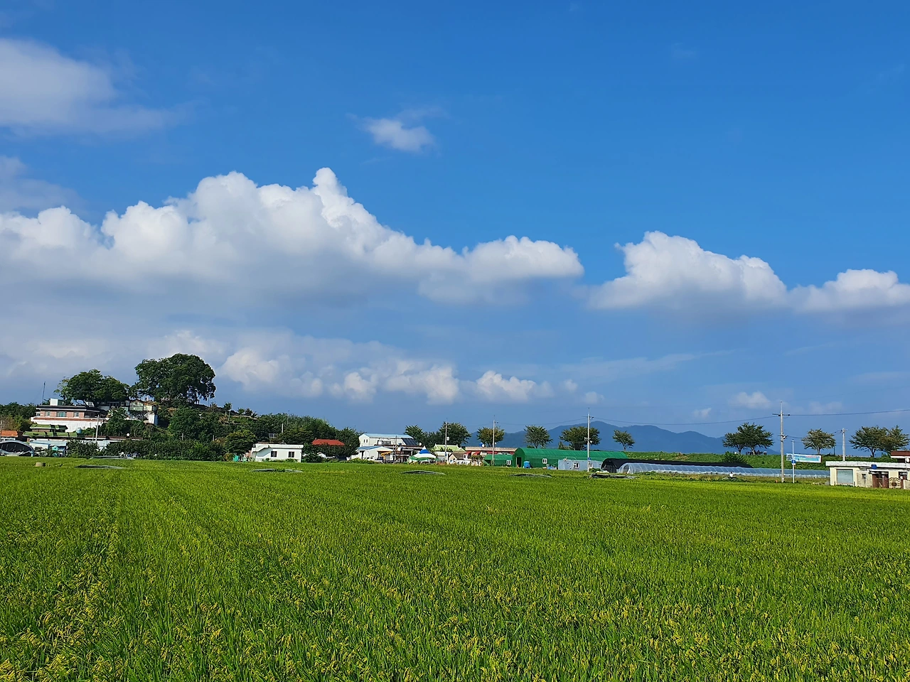 쏟아지는 햇살을 양산으로 방어하며 우리는 마을 주변을 두리번거리며 걷기 시작했다. 사방이 푸른빛의 벼가 한창 여물어가는 논이었고 30여 채의 집들 뒤로 펼쳐진, 둔턱이 높은 도로를 따라 드문드문 심어진 가로수들이 푸른 하늘을 배경으로 서 있는 모습이 말 그대로 한 폭의 수채화 같았다.