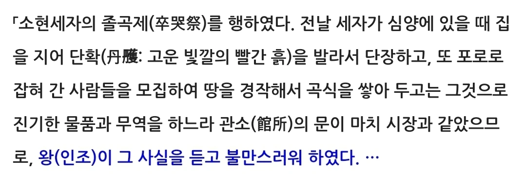 세자 사후 2달 만에 치른 졸곡제에서도 상업에 능했던 세자를 못마땅해하는 인조의 심기가 내비친다.