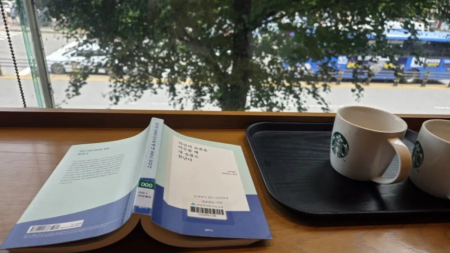 오늘 카페에서 펼친 책은 **이미령 작가의 『타인의 슬픔을 마주할 때 내 슬픔도 끝난다』**였다.