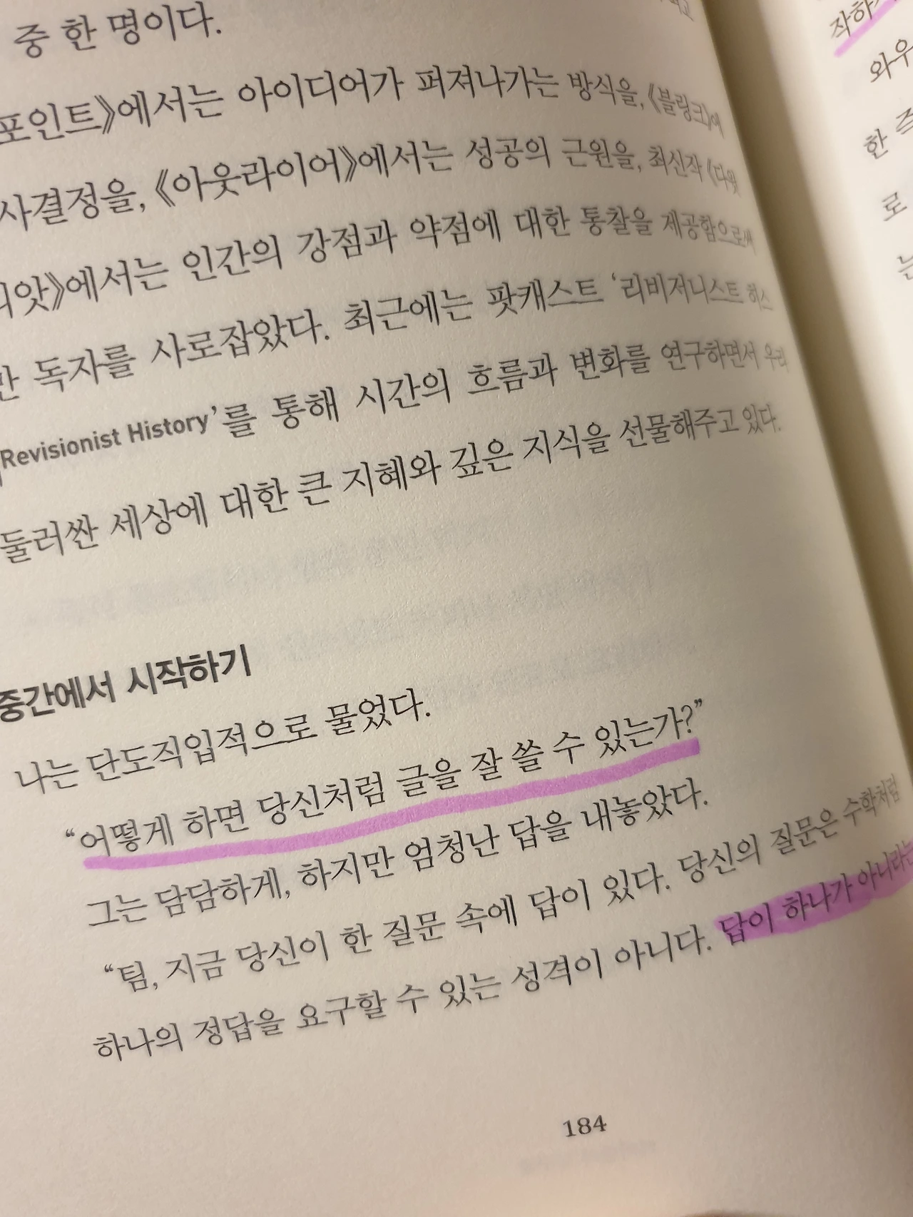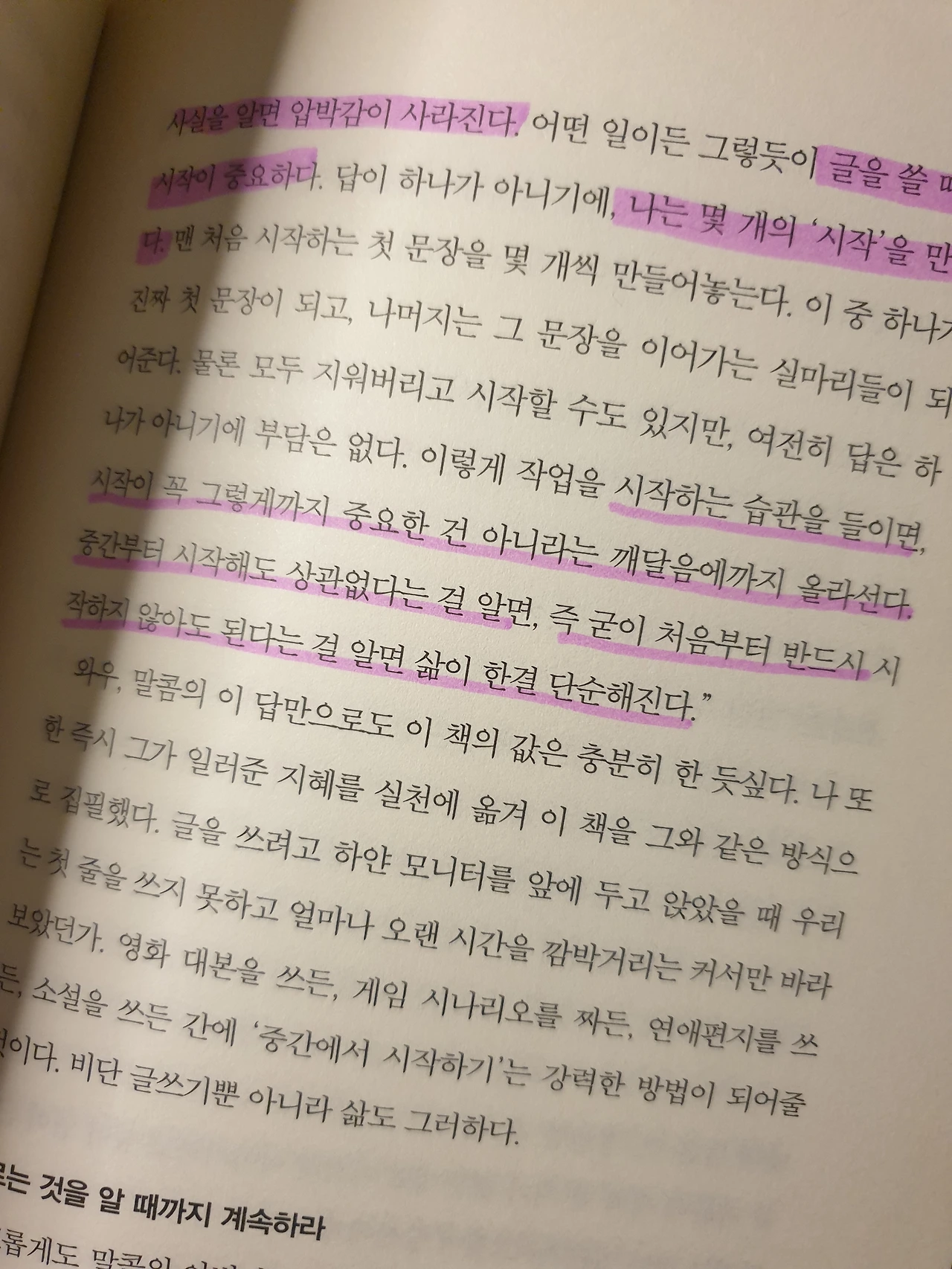 "어떻게 하면 당신처럼 들을 잘 쓸 수 있는가?"에 대한 물음에 "답은 하나가 아니라는 사실을 알면 압박감이 사라진다. 어떤 일이든 그렇듯이 글을 쓸 때도 시작이 중요하다. 답이 하나가 아니기에, 나는 몇 개의 '시작'을 만든다. 이렇게 시작하는 습관을 들이면 시작이 꼭 그렇게까지 중요한 건 아니라는 깨달음에까지 올라선다. 중간부터 시작해도 상관없다는 걸 알면, 즉 굳이 처음부터 반드시 시작하지 않아도 된다는 걸 알면 삶이 한결 단순해진다. _ 타이탄의 도구들(팀 페리스) P. 184