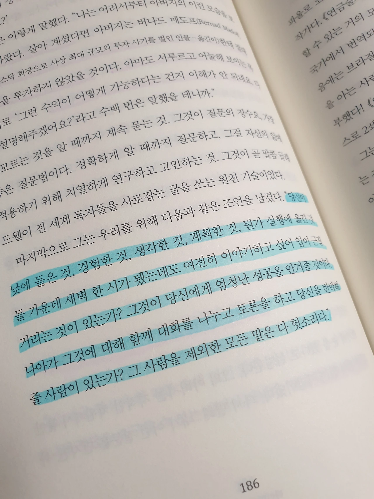당신이 낮에 들은 것, 경험한 것, 생각한 것, 계획한 것, 뭔가 실행에 옮긴 것 들 가운데 새벽 한 시가 됐는데도 여전히 이야기하고 싶어 입이 근질 거리는 것이 있는가? 그것이 당신에게 엄청난 성공을 안겨줄 것이다. 나아가 그것에 대해 함께 대화를 나누고 토론을 하고 당시늘 반박해 줄 사람이 있는가? 그 사람을 제외한 모든 말은 다 헛소리다. _ 타이탄의 도구들(팀 페리스) P. 186