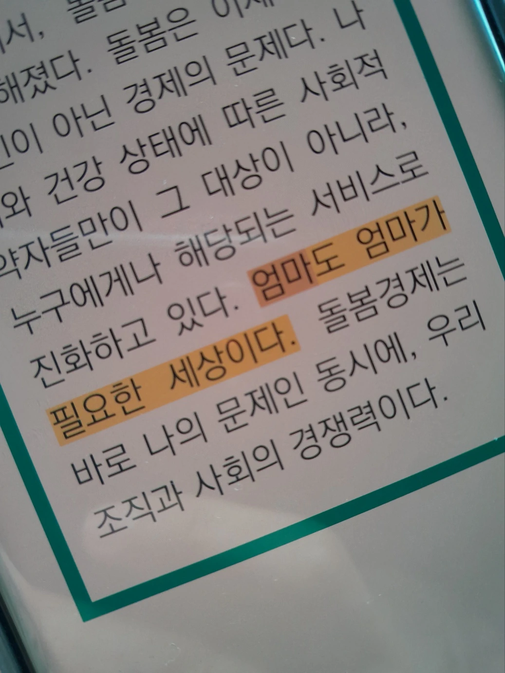 7. 돌봄 경제에서 엄마도 엄마가 필요하다는 문장에 이끌렸다. 나도 내가 엄마이지만 엄마가 필요하다는 말에 격렬히 공감했으며, 실제 우리 가게에서 음식 배송과 함께 보내는 메시지에서 "독감 주사 맞으셨나요? 잊지 말고 독감 주사 꼭 맞으세요"라고 메시지를 보냈더니 이에 감사하다고 깜박했는데 이번주에 독감주사를 맞으러 가야겠다는 메시지를 주는 손님들이 있었다. 또 된장찌개나 김치찌개, 나물류와 같은 엄마가 집에서 해주시는 음식에 대한 반응이 유독 좋고, 친정엄마가 생각난다며 고맙다고 메시지를 전해주는 손님들이 많다. 손님들에게 바쁜 일상 속 아침 먹었냐, 저녁 먹어라 잔소리하며 따뜻하고 건강한, 맛있는 식사를 챙겨주는 엄마이고 싶다. 따뜻함을 전하는 내가 되기를♡