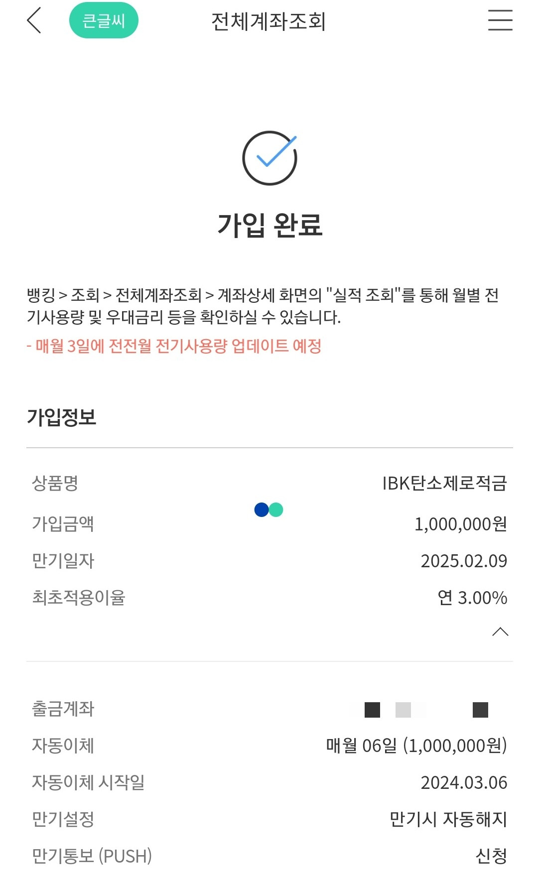 우선 내년 비용 마련을 위해 정기적금을 들었습니다. 주 거래은행인 기업은행에서 탄소제로적금이라고 전기세 아끼면 이율을 더 주는 적금인데 적금영역에서 1번으로 보여 그냥 가입했습니다. 전기도 아끼고 좋네요^^