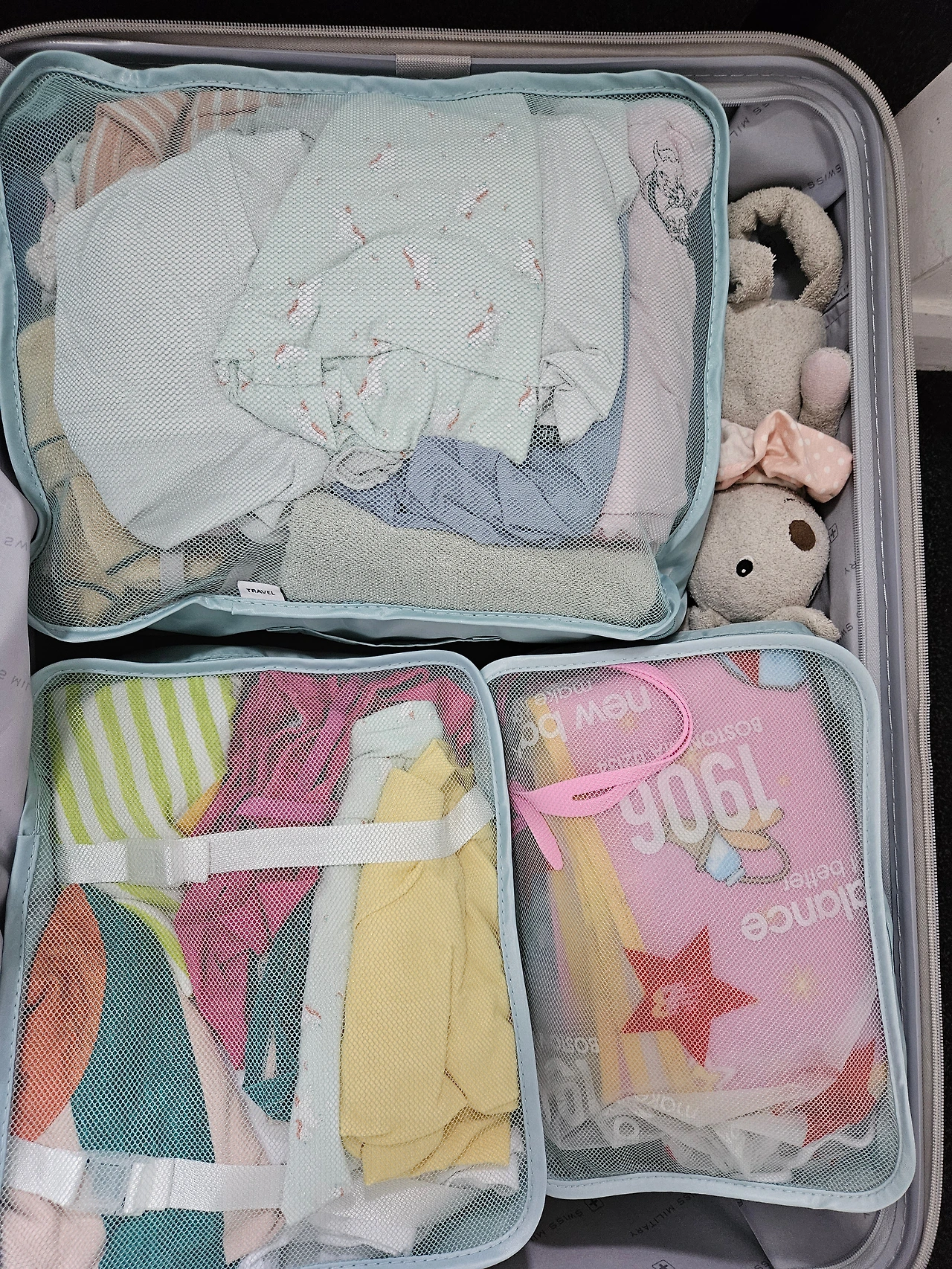 1. 아이 옷은 상하복으로 4벌, 엄마 옷은 원피스 4벌, 각 긴팔, 긴바지 하나씩, 수영복도 하나씩!