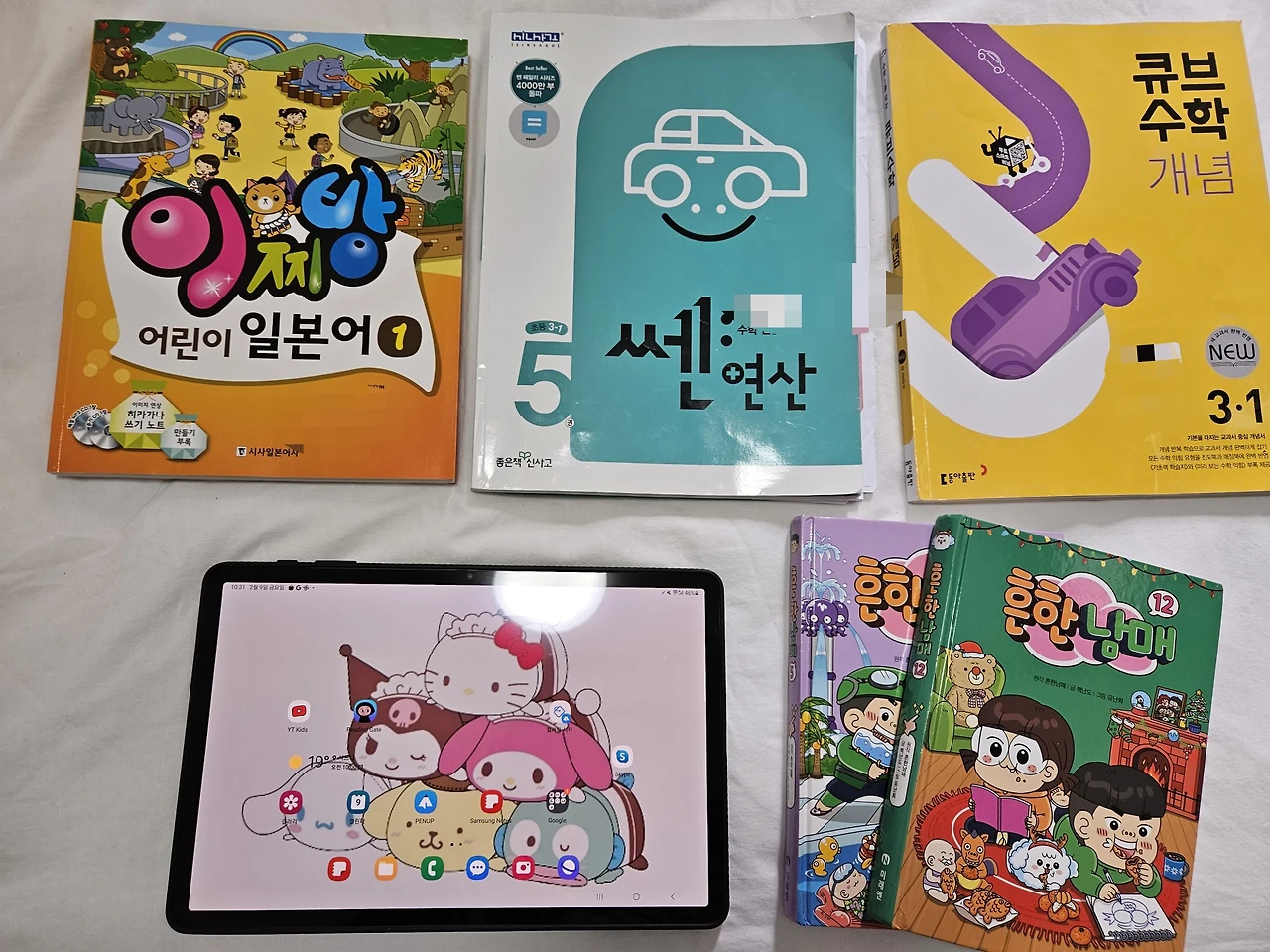 작년에 문제집이랑 책을 정말 많이 가져가서 캐리어랑 가방이랑 너무 무거워서 힘들고 아이가 문제집 안 풀어서 또 힘들고 책도 안 봐서 힘들고, 이래저래 많이 힘들었어요. 어학원 다니고 놀러 다니느라 시간도 없어서 공부하거나 책 보는 시간도 부족했고요. 그래서 올해는 수학문제집 딱 2권만 들고 왔어요. 그리고 갑자기 관심 가지게 된 일본어 문제집 챙겼고요. 비행기에서 읽는다고 흔한 남매 2권 챙기고 끝!
