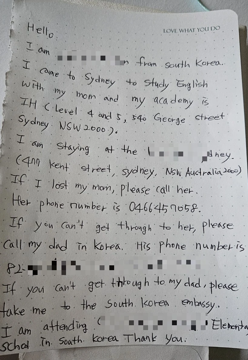 Hello, my name is Kim Bom. I am from South Korea. I am here with my mom to study English in Sydney. My English academy name is 00 (address, phone number). I am staying at the 00 Hotel in Sydney (address, phone number). If I lost my mom, please call my mom's cell phone (my mom's local phone number). If she doesn't answer the phone, please call my dad in South Korea. My dad's phone number is 00000. If he doesn't answer the phone, please take me to the South Korean embassy. I am attending 00 elementary school in South Korea.