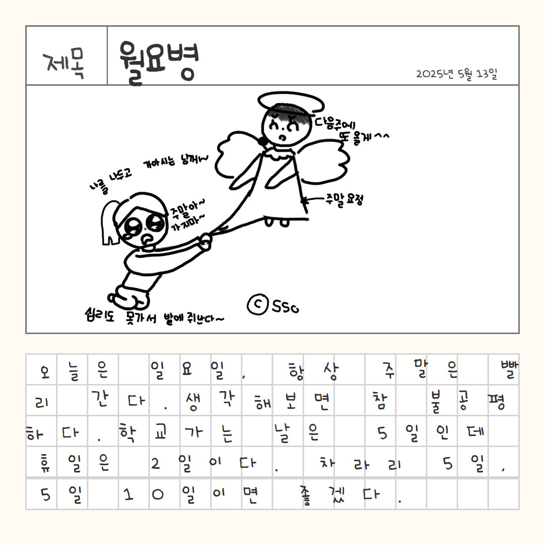 오늘은 일요일, 항상 주말은 빨리 간다. 생각해 보면 참 불공평하다. 학교 가는 날은 5일인데 휴일은 2일이다. 차라리 5일, 5일 십일이었으면 좋겠다. 왜냐하면 나는 월요병에 걸렸기 때문이다. 일주일의 시작부터 학원이 2개가 있다. 학원을 한 군데 가면 한 군데를 더 가야 한다! 그리고 나는 일요일 저녁만 되면 일주일이 걱정된다. 월요일이 지나고 화요일 되면 더 걱정된다. 수영 선생님이나 음악 선생님이 혼내시면 어떡하지? 같은 걱정들이 끝도 없이 나오다. 왜 월요병은 약이 없는 걸까? 월요병이 심해지면 일요일 아침부터 흐느적거릴지도 모른다. 아! 내일이 월요일이다......너무 힘들다. 크면 괜찮아지겠지. 어쩌면 크면서 월요병이 없어질 수도 있다. 그래서 기다릴 거다. (엄마가 월요병 주사가 있다고 했지만 진짜인지는 모르겠다)