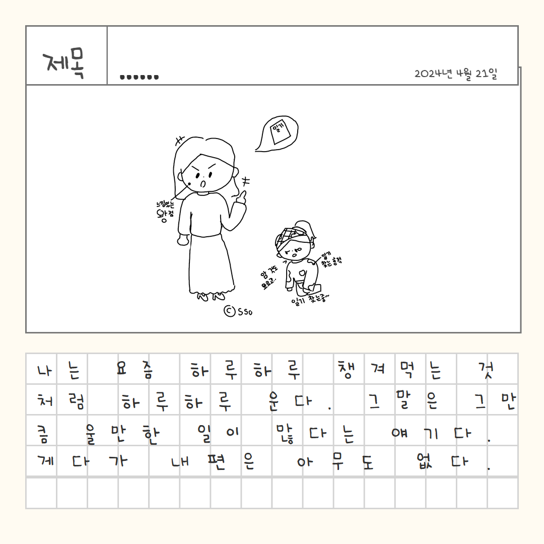 혹시 아이의 일기장을 보셨냐는 이야기였다. 요즘 가정에서 아이에게 어떤 일이 있는지 물어보시는 내용이었다. 아이가 처한 가정환경을 조사하는 느낌이었다. 아홉 살 아이가 월요일도 화요일도 수요일도 일주일 동안 매일 울고 엄마도 아빠도 언니도 고양이마저 자기편이 없다고 썼으니 그럴 만도 했다. 마치 변명처럼 엄마인 저한테 혼이 나고 들어가서 쓴 일기라서 감정표현이 너무나 생생하게 써졌다는 설명을 하고 우리 집에는 아무런 문제가 없으며 나는 너무나 정상적인 엄마라는 것을 증명해야 했다.