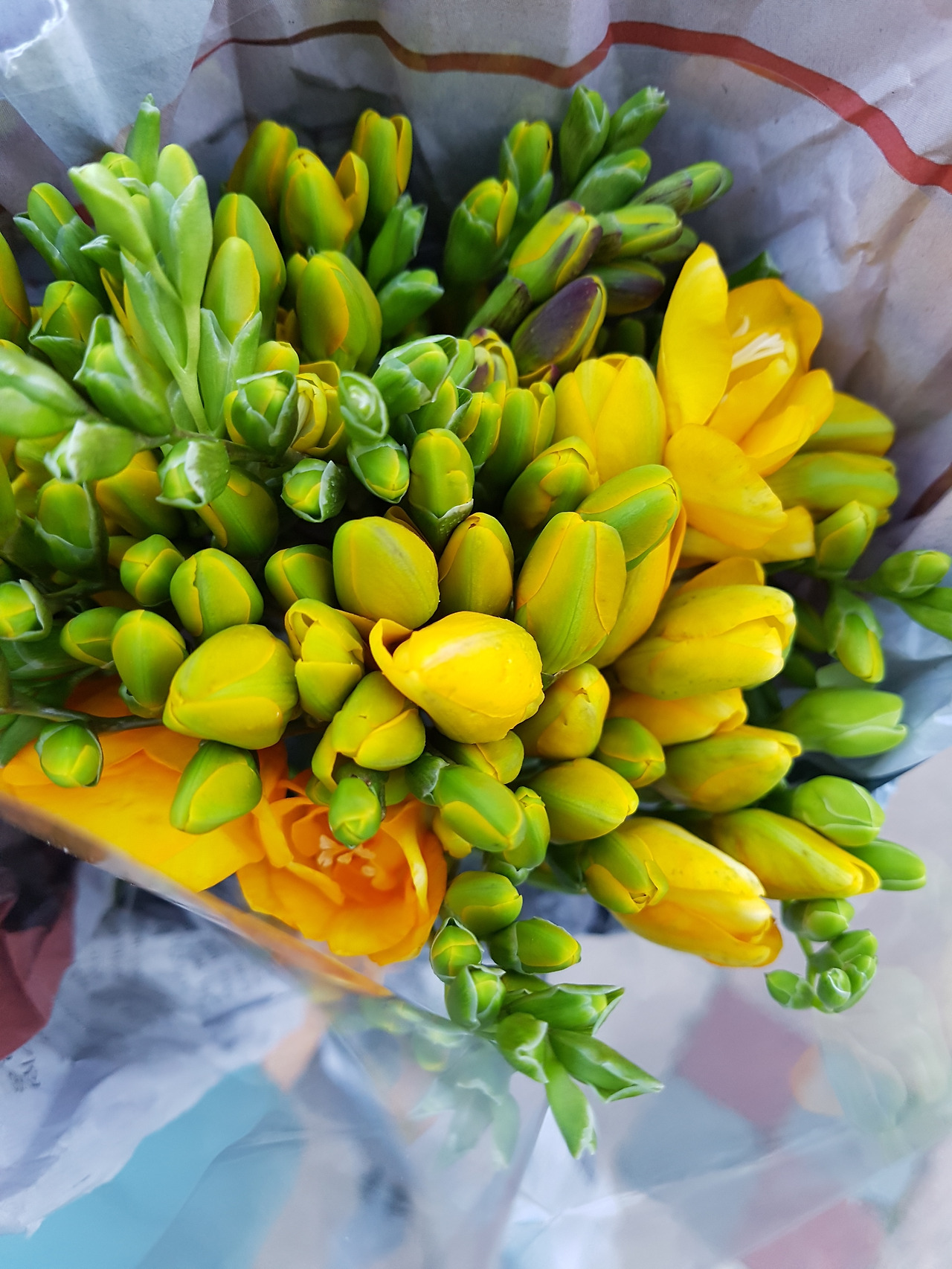 집에 돌아와 프리지어 다발을 풀어놓고 유리병에 꽂았다.