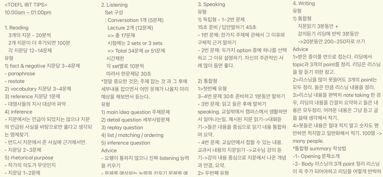 혹시 지금 이 글을 보시는 분들 중에 TOEFL 시험을 준비하는 분이 계시다면 각 테스트 섹션 (Reading, Listening, Speaking, and Writing) 마다 자기만의 정리노트를 만드시기를 추천한다. 완전히 각 섹션의 문제 구조와 질문 형태를 머리에 쥐가 날 정도로 인지하고 있어야지만 시험이라는 제도에 여러분의 영어실력이 가려지지 않는다. 아래는 조금이나마 여러분의 이해를 돕고 도움이 될 수 있도록 내가 만들었던 TOEFL IBT 시험 대비 준비집의 일부분을 공유한다.