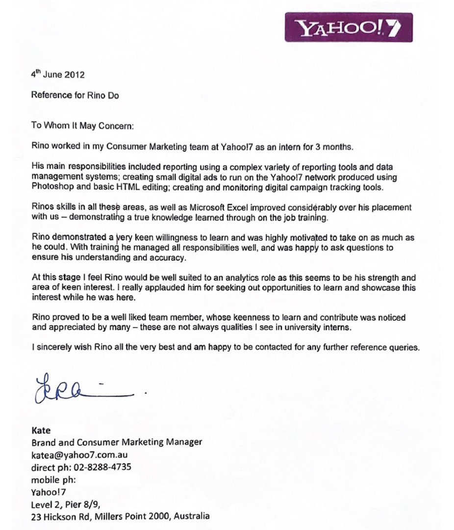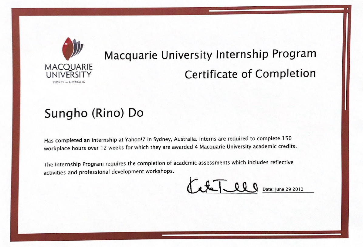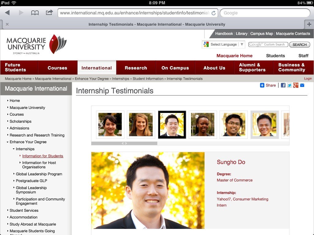 Yahoo!7에서 했던 총 인턴쉽 기간은 3개월이었다. 아쉬웠지만 나는 정들었던 팀과 작별 인사를 해야 했다. 인턴쉽이 끝난 이후에도 나를 전담해서 내 업무를 도와줬던 Sarah와 가끔 연락했다. 지금 모두 다 Yahoo가 아닌 다른 곳에서 일을 하고 있지만 같은 디지털 마케팅 분야에서 다들 열심히 일하며 지내고 있다. 아래는 Consumer Marketing 팀장 Kate에게 사인받은 맥쿼리 대학교 인턴쉽 이수 수료증, Kate에게 받은 추천서, 그리고 대학원 웹사이트 올라간 나의 인턴쉽 성공사례이다. 두 번의 인턴쉽을 끝마친 나는 다음 인턴쉽도 잘 구할 수 있을 거라는 자신감이 들었다. 어느 정도 호주 회사의 업무 스타일도 경험을 해서 조금 익숙해질 수 있었고 새로운 인턴쉽 인터뷰 때는 이미 했던 두 번의 인턴쉽 경험을 토대를 인터뷰를 임하면 되었기에 어느 정도 한 숨을 놓을 수 있었다. 하지만 모든 것이 잘 되고 있다고 생각했을 때 항상 변수 있듯이, 나의 세 번째 인턴쉽 생활은 녹록하지 못했다. 하지만 어떻게 항상 잘할 수만 있으랴? 내 자신이 너무 이방인 같은 느낌을 많이 받았던 세 번째 인턴쉽 경험을 다음 글에 공유하자고 한다.