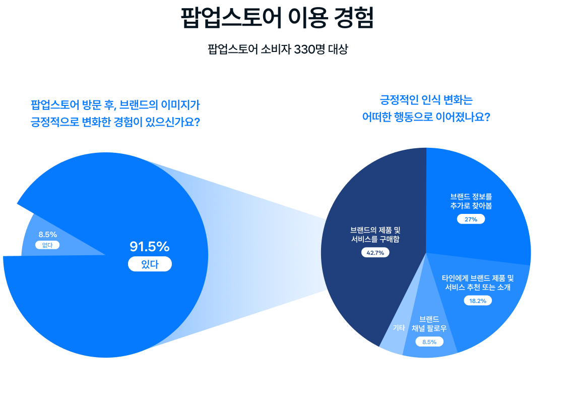스위트스팟이 올해 300명을 대상으로 진행한 설문조사에 따르면, 무려 91.5%가 팝업스토어에 방문 후, 브랜드의 이미지가 긍정적으로 변화했다고 밝혔어요. 이는 팝업스토어가 단순히 제품을 판매하는 공간을 넘어, 브랜드의 이미지를 긍정적으로 구축하는 데 큰 역할을 하고 있다는 점을 보여주고 있습니다.