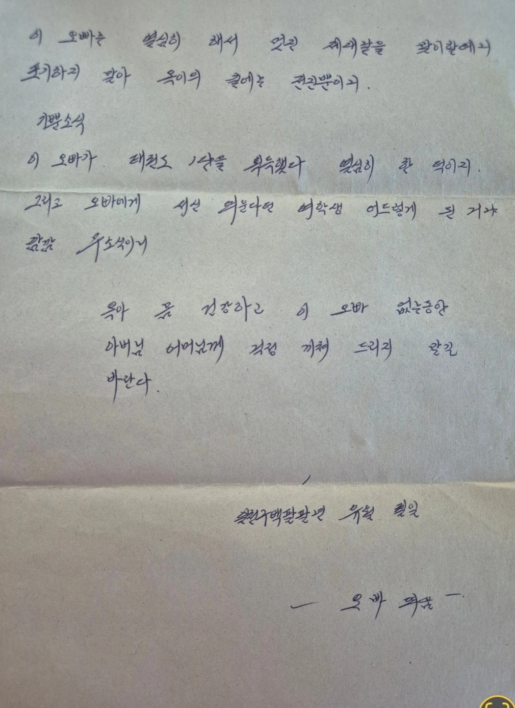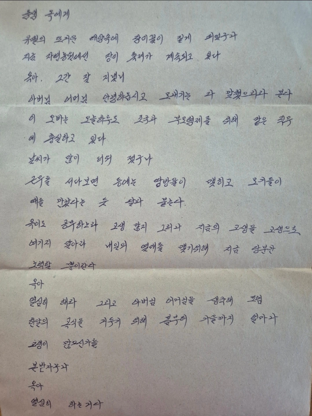옥아, 몸 건강히 지내고, 오빠 없는 동안 아버님 어머님께 걱정 끼치지 말도록 하여라.