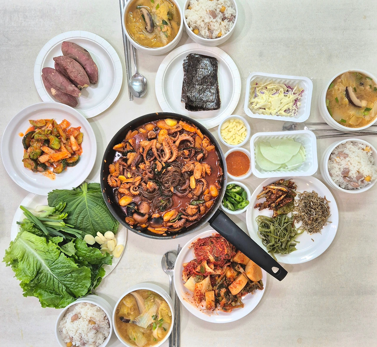 강릉 숙소에 도착하자마자 식탁에 올라온 뜨끈한 주꾸미볶음.