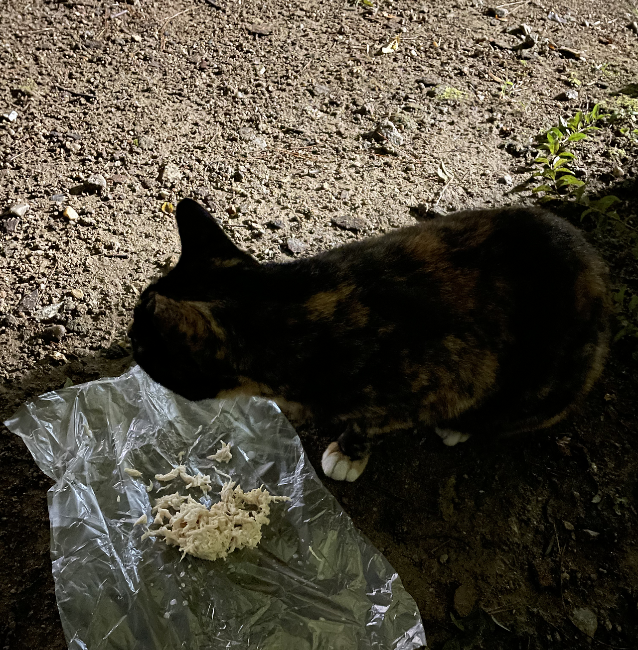 그러던 어느날 집에서 치킨을 시켜먹게 되었는데, 문득 냥이 생각이 났다. 왠지 치킨도 잘 먹을것 같아 가슴살 부위를 골라 튀김옷을 벗기고 돌려깎기 하듯 바깥쪽 살도 발라내 속살만 추려냈다. 그러다보니 4~5조각 정도는 추려야 한번 먹을 양이 나왔다. 혹시나 하고 가져가 본 닭고기는 대성공이었다. 우리 냥이가 너무 잘 먹었던 것. ‘너 닭가슴살 좋아하는 고양이였구나~’