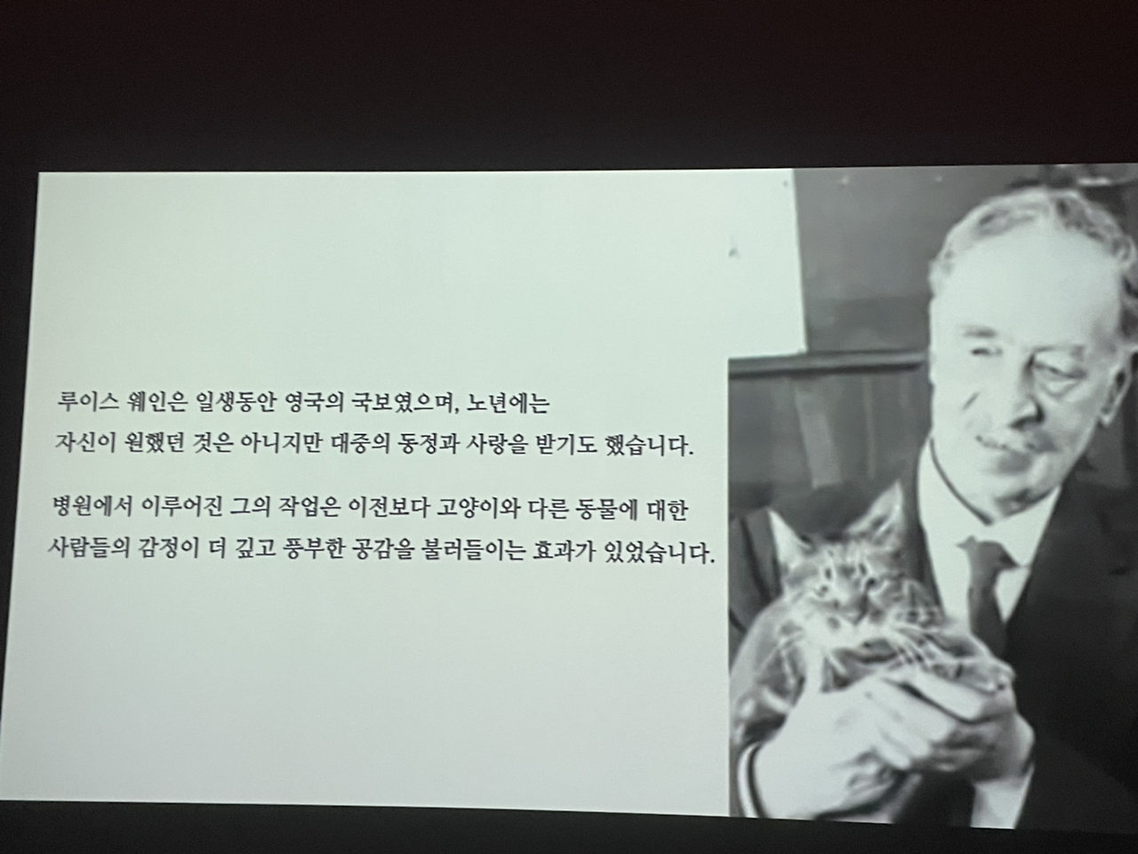 전시장으로 들어가며 이런 사랑스러운 고양이 그림을 그려주신 루이스 웨인님의 사진을 보며 마음 속으로 감사의 마음을 전했다. 잠시 루이스 웨인을 소개해 드리자면. 루이스 웨인은 1860년 영국 런던에서 태어났다. 하지만 어린 시절 소심하고 예민한 성격 탓에 또래들과 어울리기 힘들어했다고 한다. 그래도 그림에 흥미와 재능을 발견하고 예술학교에 진학해 나중에 미술교사가 되었다는데.