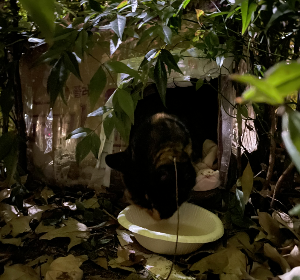 아...!! 그랬구나… 어딘지는 모르지만 냥이의 평소 잠자리보다 이 조그만 택배 상자가 더 따뜻한 공간이었구나... 이런 생각이 들자 눈물이 날 것 같았다. 공원에 길고양이집을 마련해두면 혹시나 민원을 넣거나 훼손하는 사람이 생길까봐, 그래서 이곳을 찾는 고양이들이 더 노출돼 밥자리에까지 나쁜 영향이 미칠까 망설였는데, 내 생각이 짧았구나 싶었다. 야무지게 고양이집을 마련해주신 분이 너무나 고맙고 또 고맙다.