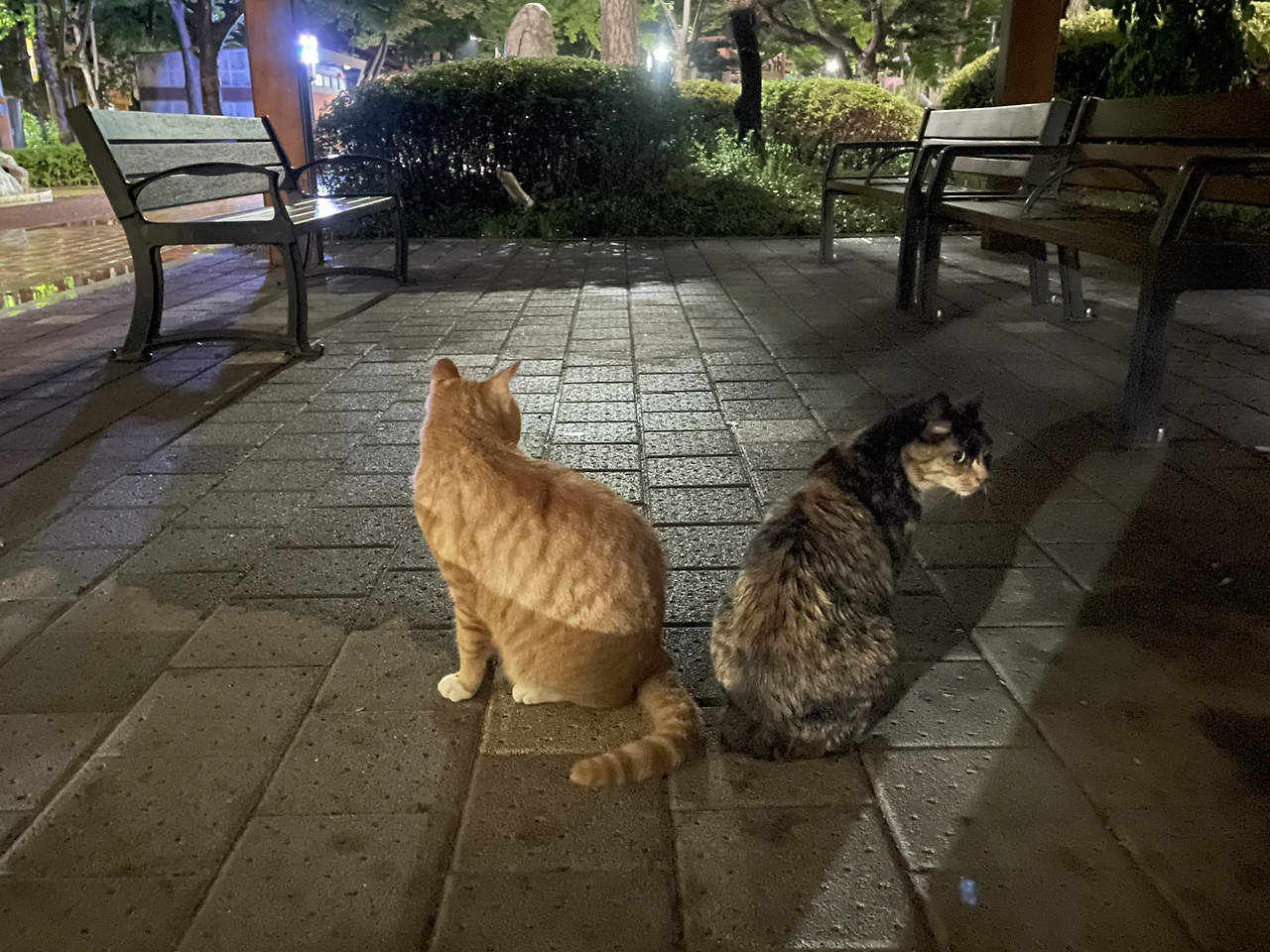 우리가 서로를 알아보고 반가워한 이후로 냥이는 공원의 두군데 밥자리를 적절히 옮겨가며 꿋꿋하게 길 생활을 이어왔다. 공원 밥자리가 비교적 편안하게 밥을 먹을 수 있는 자리라고 소문이라도 난 건지, 동네 고양이들이 숱하게 공원 밥자리를 찾아왔다 사라지곤 했다. 우리 냥이는 나름 공원 밥자리의 정기 고객인데 그 숱한 길고양이들 중에 한번씩 마음에 맞는 친구를 만나기도 했다.