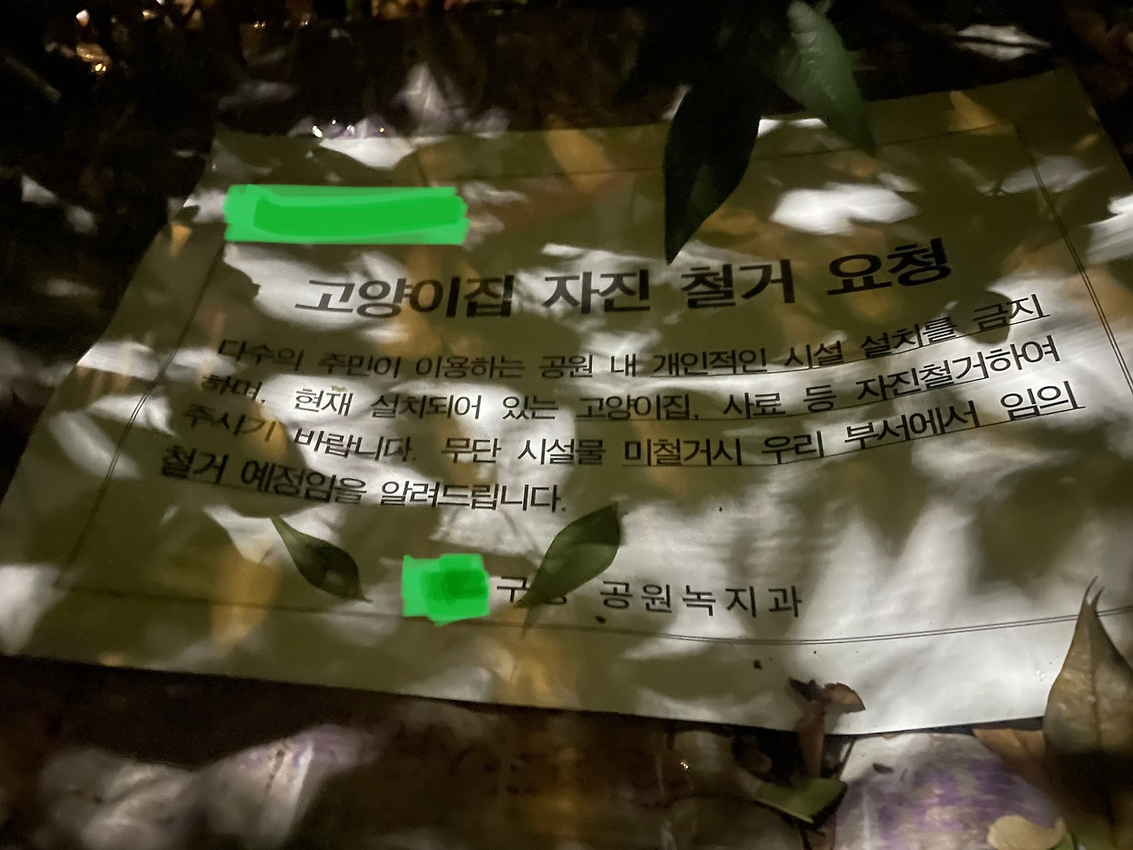 작년에 공원에서 밥을 먹는 우리 ‘냥이’와 그녀의 친구 ‘노랭이’는 박스로 만든 집에서 그럭저럭 겨울을 무사히 보냈다. 하지만 그 과정이 결코 평탄하지만은 않았는데. 누군가 길고양이집을 치워달라는 민원을 넣어 철거 요청서가 붙어있곤 했기 때문이다. 공원 내에서도 사람이 드나들지 않는 풀숲 깊숙이 놓여있는 조그만 박스집조차도 허용해주지 않는 사람이 있었던 것이다.