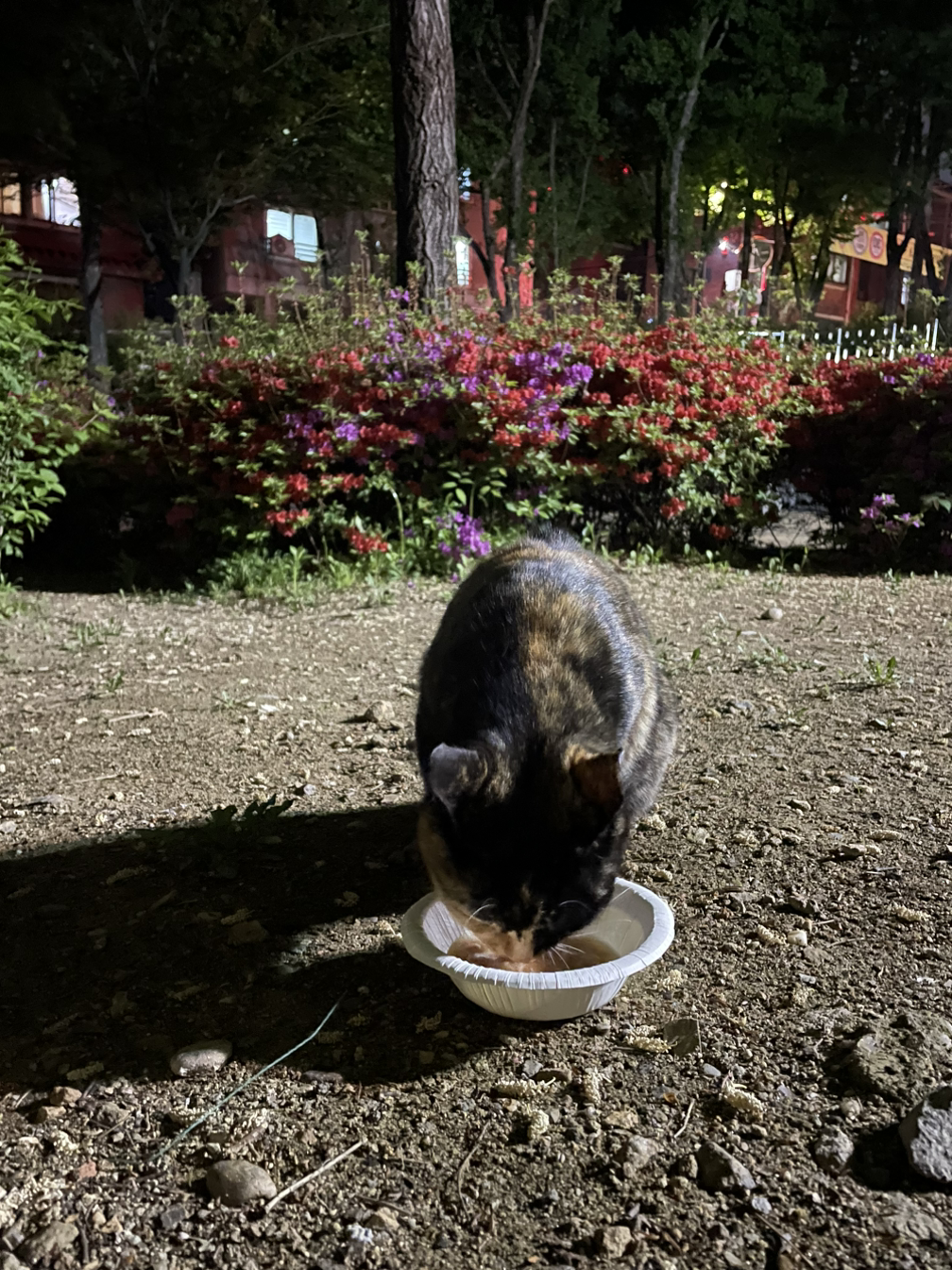 냥이는 나를 한번 빤히 바라보다가 이내 접시에 코를 박고 냠냠 뇸뇸 할짝할짝 맛있게 먹는다. 먹는 모습을 잠시 보다가 다시 걷기 운동 고고. 프리랜서로 거의 집에서 일하는 나는 일부러 시간을 내어 밖으로 나오지 않으면 하루종일 집 안에서만 지내게 된다. 일하는 시간과 쉬는 시간의 경계 없이 지내다보니 특정 시간에 무언가를 꾸준히 하는 건 쉽지 않다. 매일 저녁 운동도 꾸준히 하기가 힘들었다. 하지만 ‘냥이’를 만나면서부터 운동하러 공원에 가는 일이 조금 더 즐거워졌다. 부디 ‘냥이’도 하루 중 나를 만나는 짧은 시간이 즐겁기를.