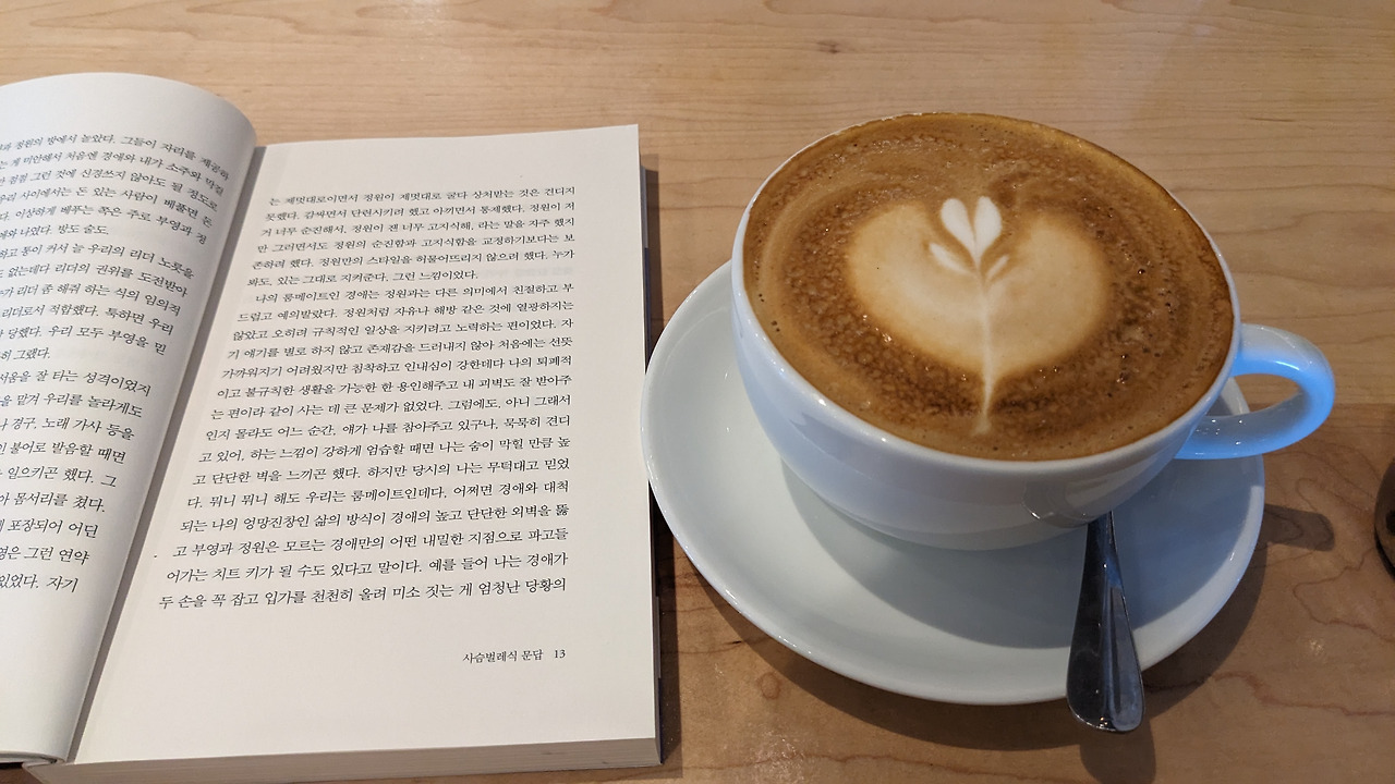 오늘도 내 가면을 부여잡고 혹여나 벗겨질까, 불안과 싸운다. 남루한 나의 밑천이 언제 드러날지 모른다 두려워하며. 책을 챙겨 일단 밖으로 나가본다. 야외 테이블에 앉아 책을 읽기 좋은 날씨다.