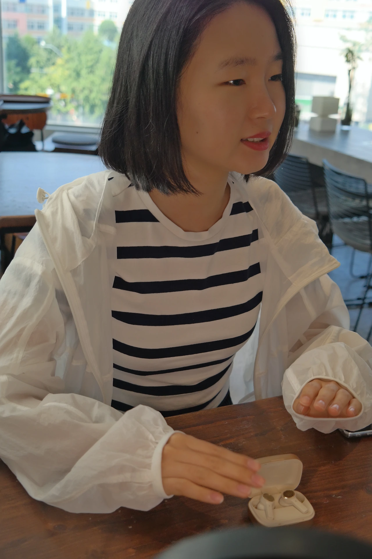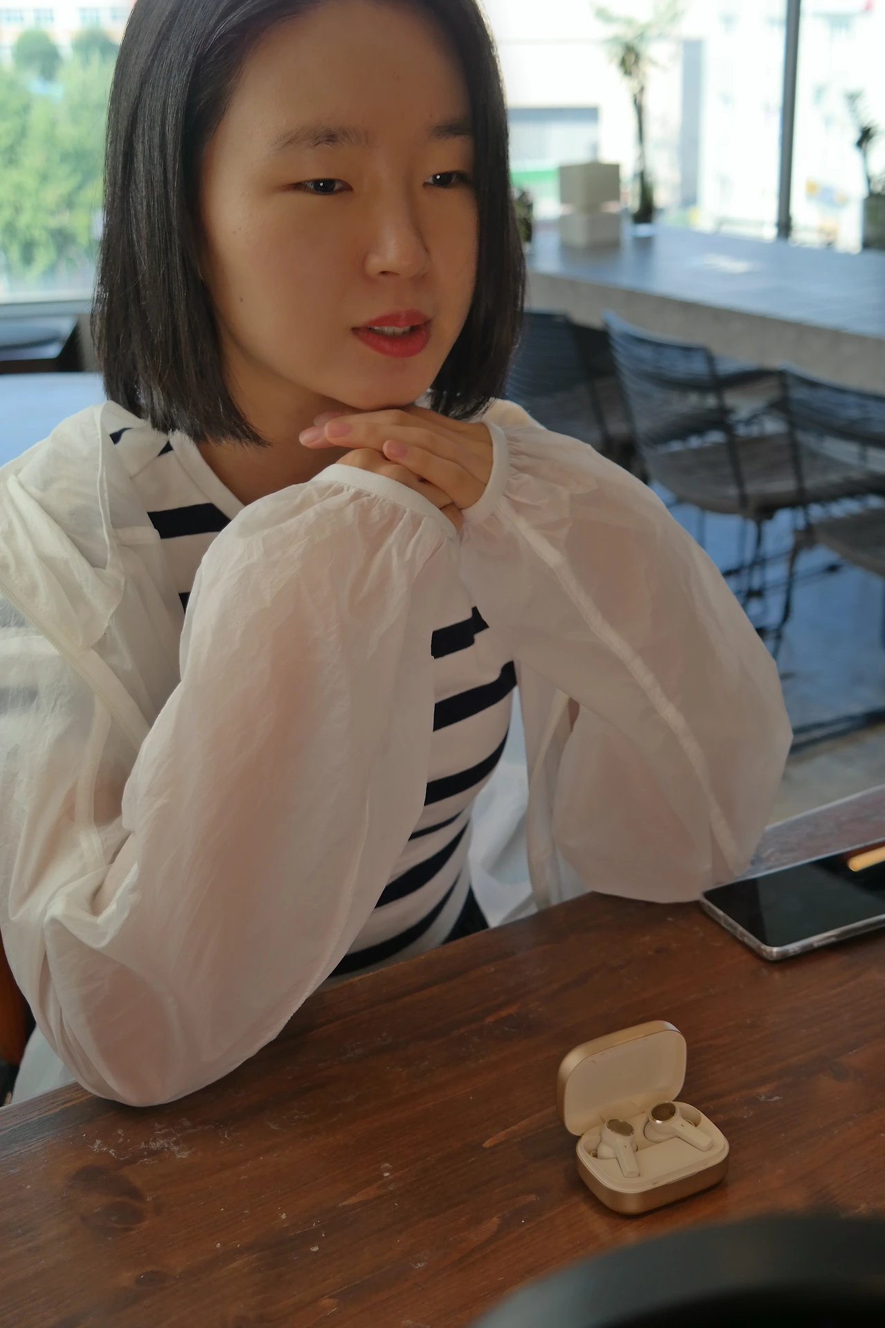 — 처음 봤을 때 케이스가 되게 특이하다고 생각했거든요, 케이스도 약간 금빛인데. 흔히들 에어팟이랑 버즈를 많이 듣잖아요. 이 둘과는 다른 이 이어폰만의 장점을 이야기해주신다면?