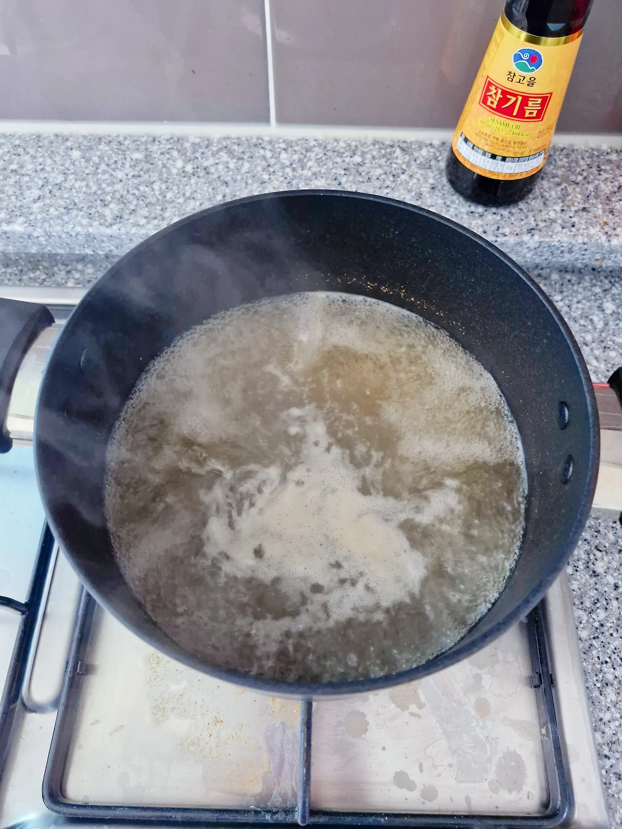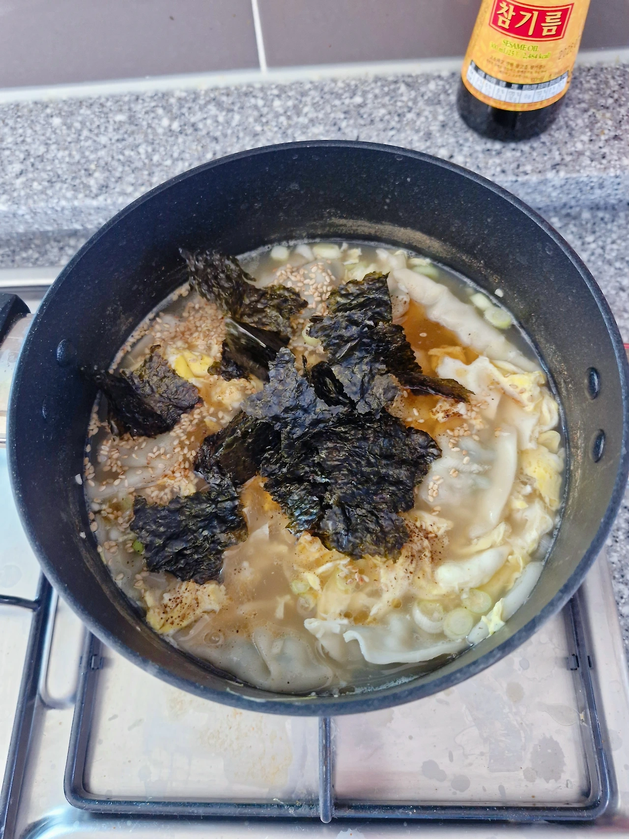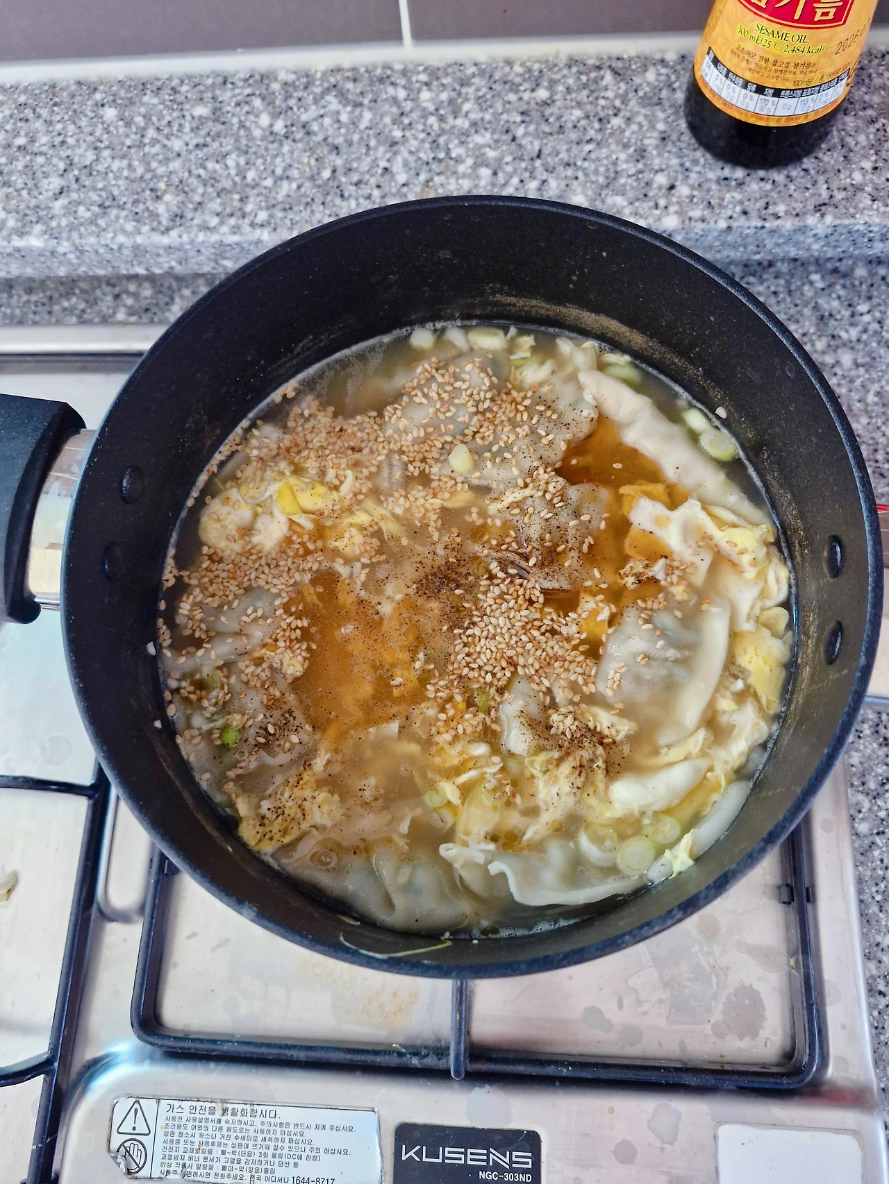 5. 냄비 불을 끄고 참기름 한 숟가락, 깨소금과 후추를 눈대중으로 넣는다.