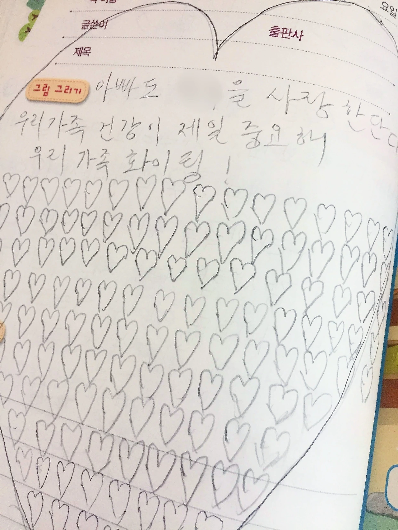 이건 내가 어릴 적 밤늦은 시간에 아빠가 퇴근할 때마다 자기 전에 아빠에게 편지를 남겨놓고 잠들었고, 늦은 시간에 퇴근하고도 나에게 답장을 남겼던 우리만의 러브레터 공책이었다. 아빠는 그 늦은 밤 가족들이 깰까 봐 화장실 불 하나를 켜두고 다음날 아침 공책을 펼쳐보고 미소 지을 딸을 떠올리며 수십 개의 하트를 투박한 손으로 그렸을게 이제야 눈에 훤히 보인다.