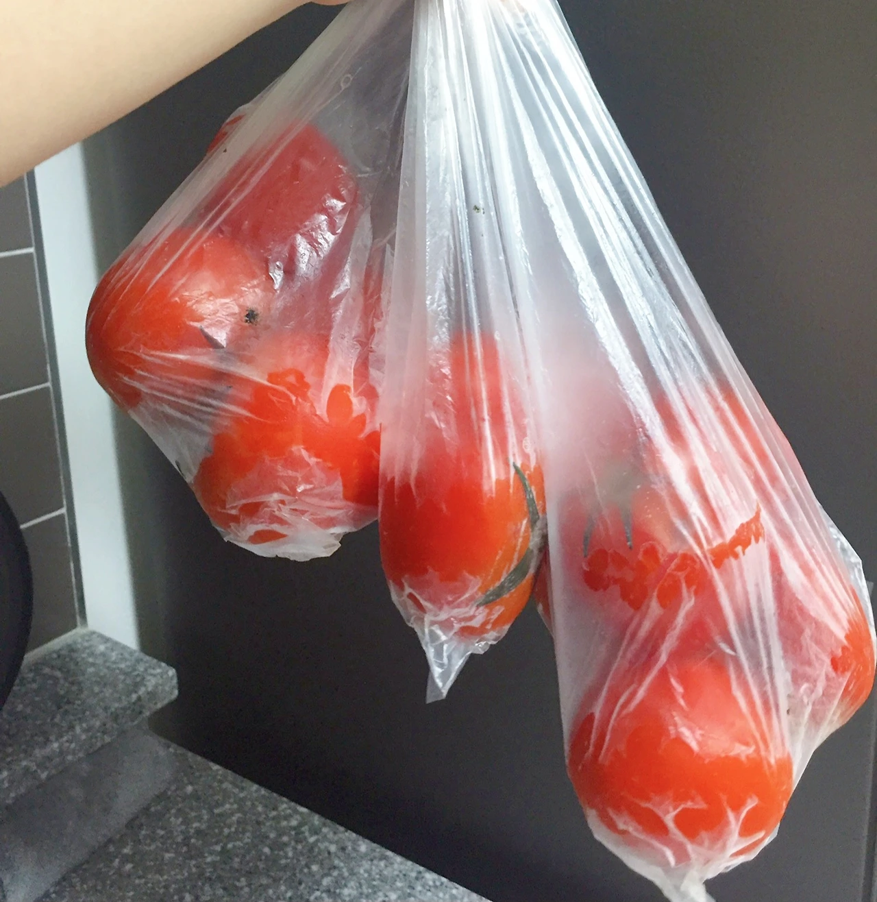 비닐봉지 세 개에 토마토를 소분해서 냉장고에 넣어두었다.