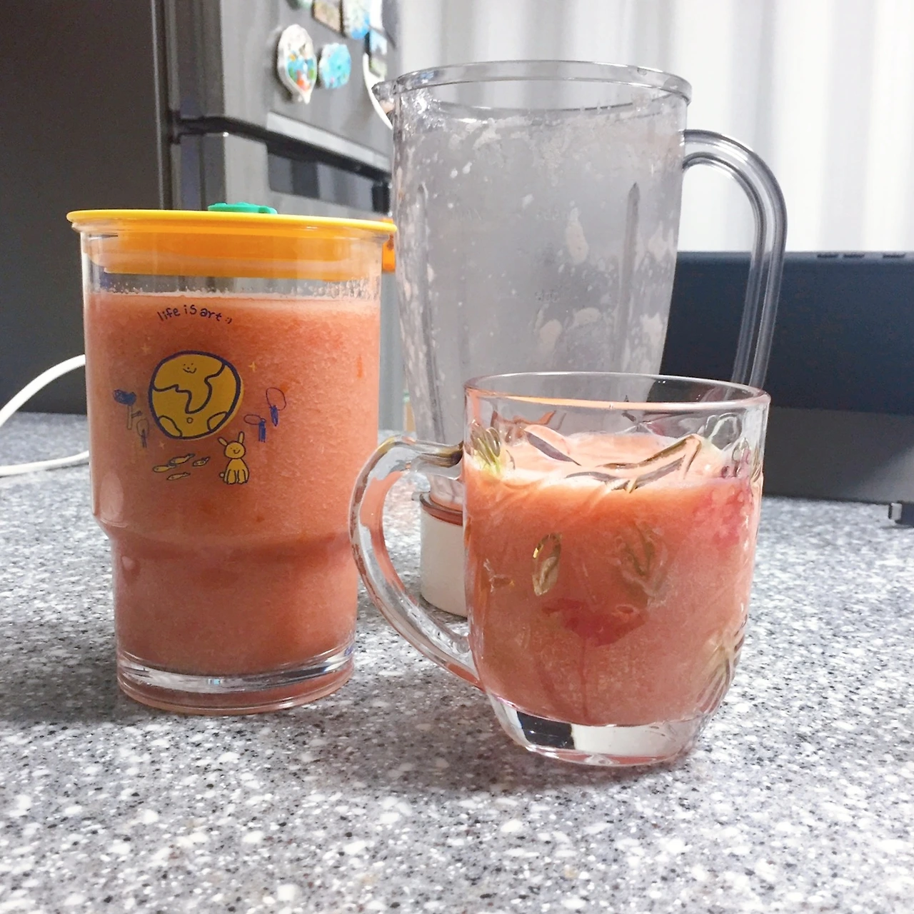 +) 추가적으로 토마토 껍질이 씹히는 게 싫다면 믹서기에 갈고 난 후, 채에 한번 거르고 마시면 목 넘김에 걸리는 것이 없어 좋다. 하지만 나는 껍질과 토마토 씨가 씹히는 게 나쁘지 않아 채에 한번 더 거르는 과정을 거치지 않는다. 귀찮기도 하고...ㅎㅎ