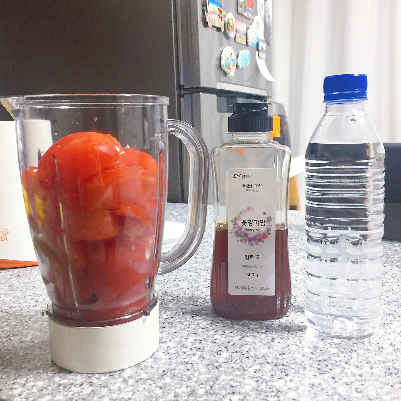 4. 생수를 토마토 양의 반 정도만 넣어준다.(묽은 토마토 주스를 원한다면!)