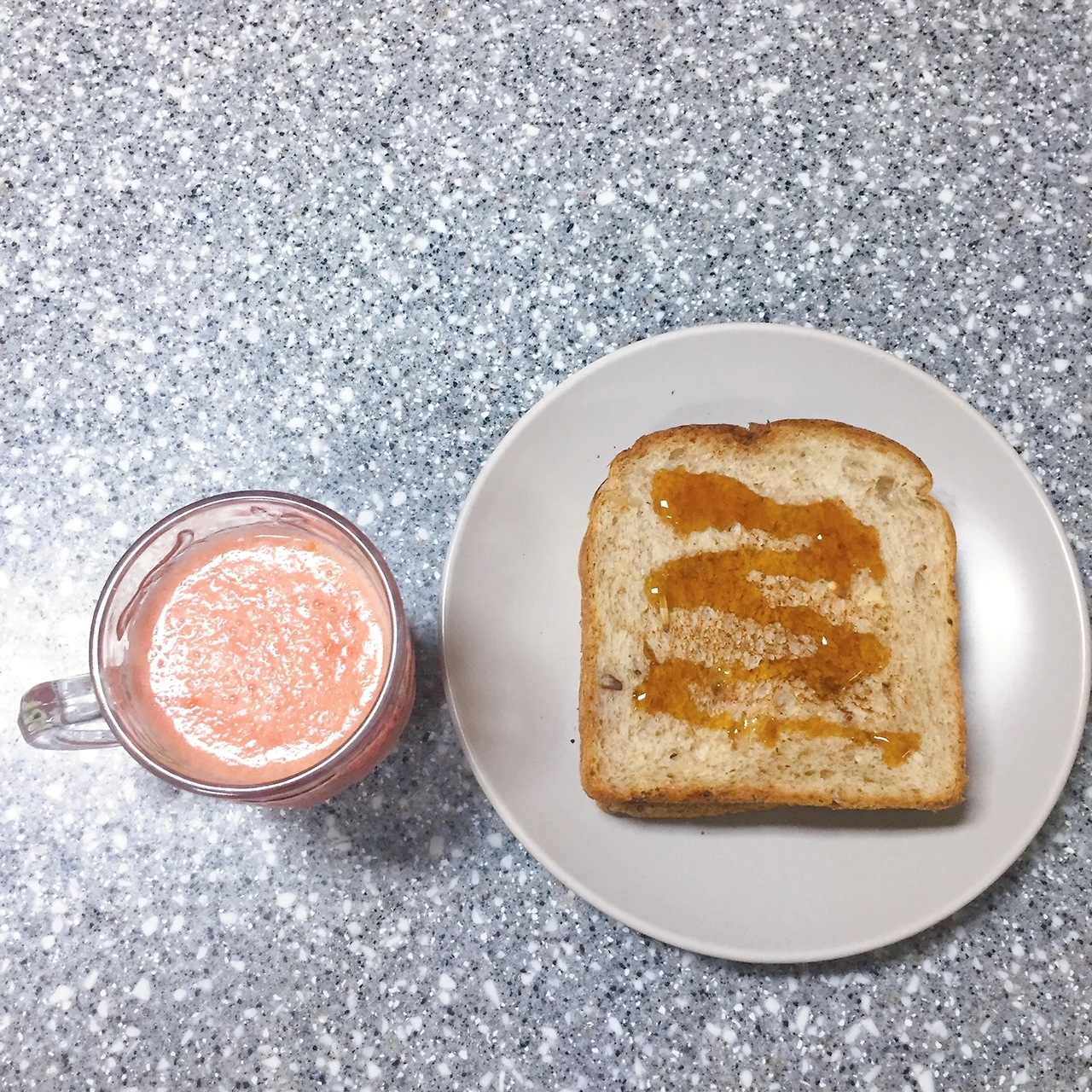 토마토주스는 어떤 것과 먹어도 꽤 잘 어울리지만, 프라이팬에 식빵 하나 바삭하게 딱 구워 꿀을 발라 함께 먹으면 더욱 맛있다.