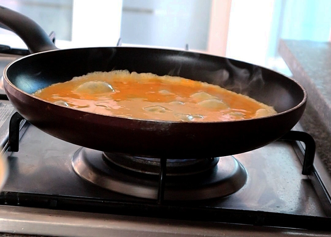 다음으로 완성된 계란물을 열이 오른 프라이팬에 올렸다.